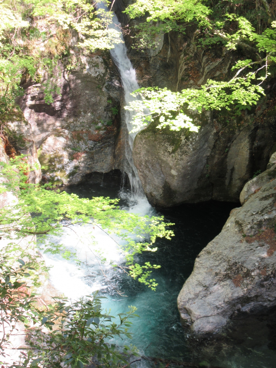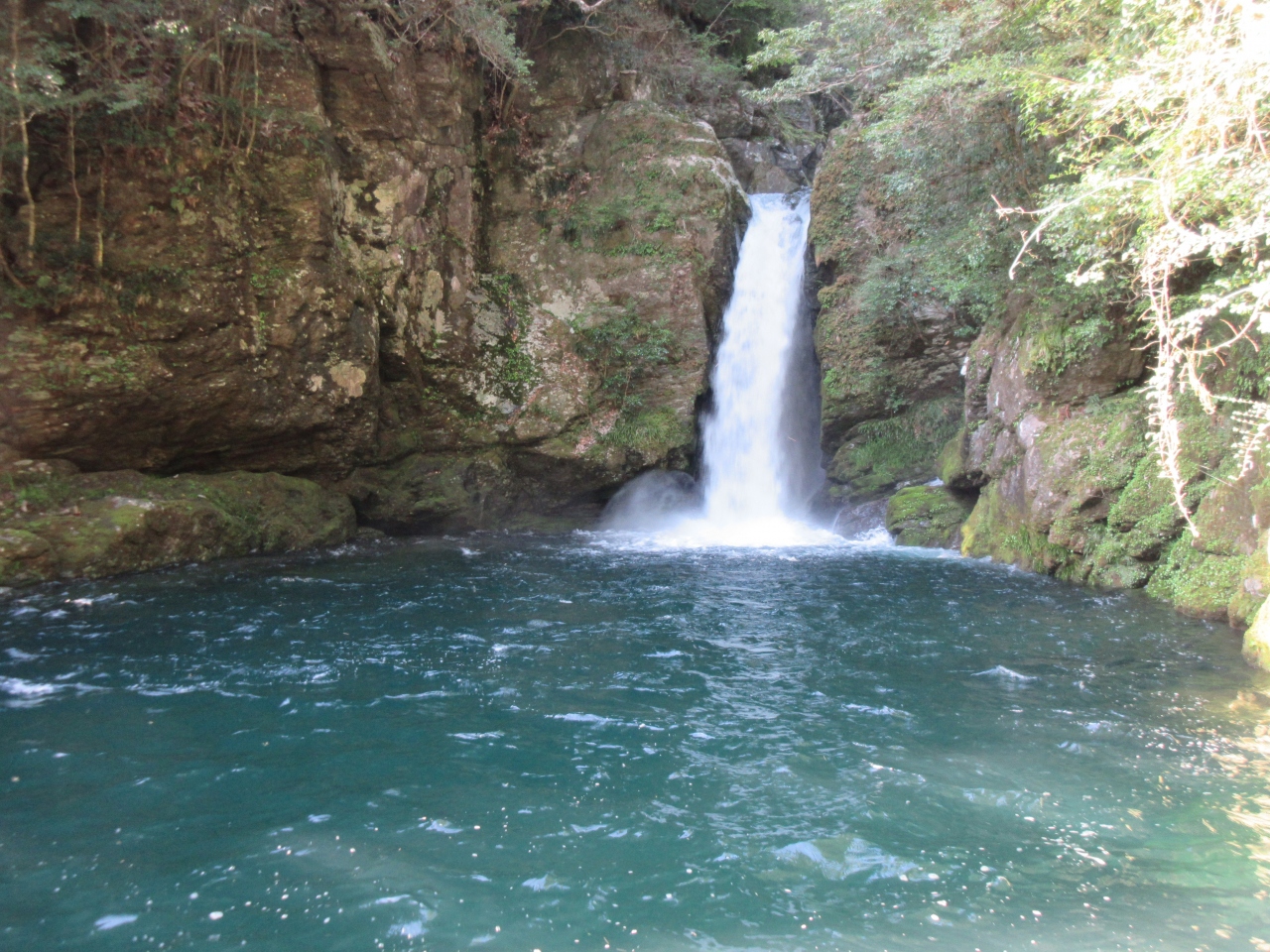 下に降りると、『仁淀ブルー』のにこ淵の滝壺があります。透明で、素敵なエメラルドグリーンの水の色です。