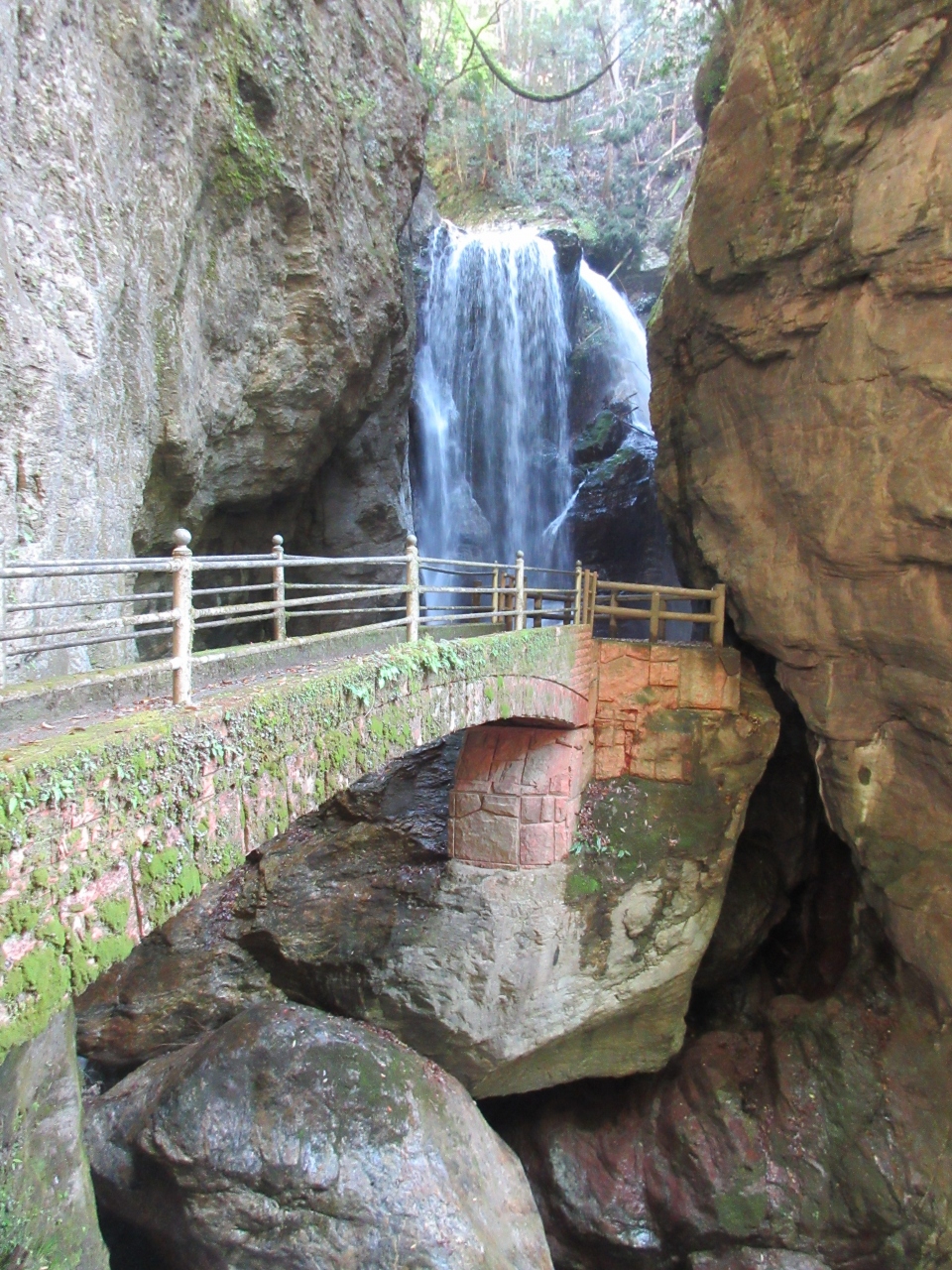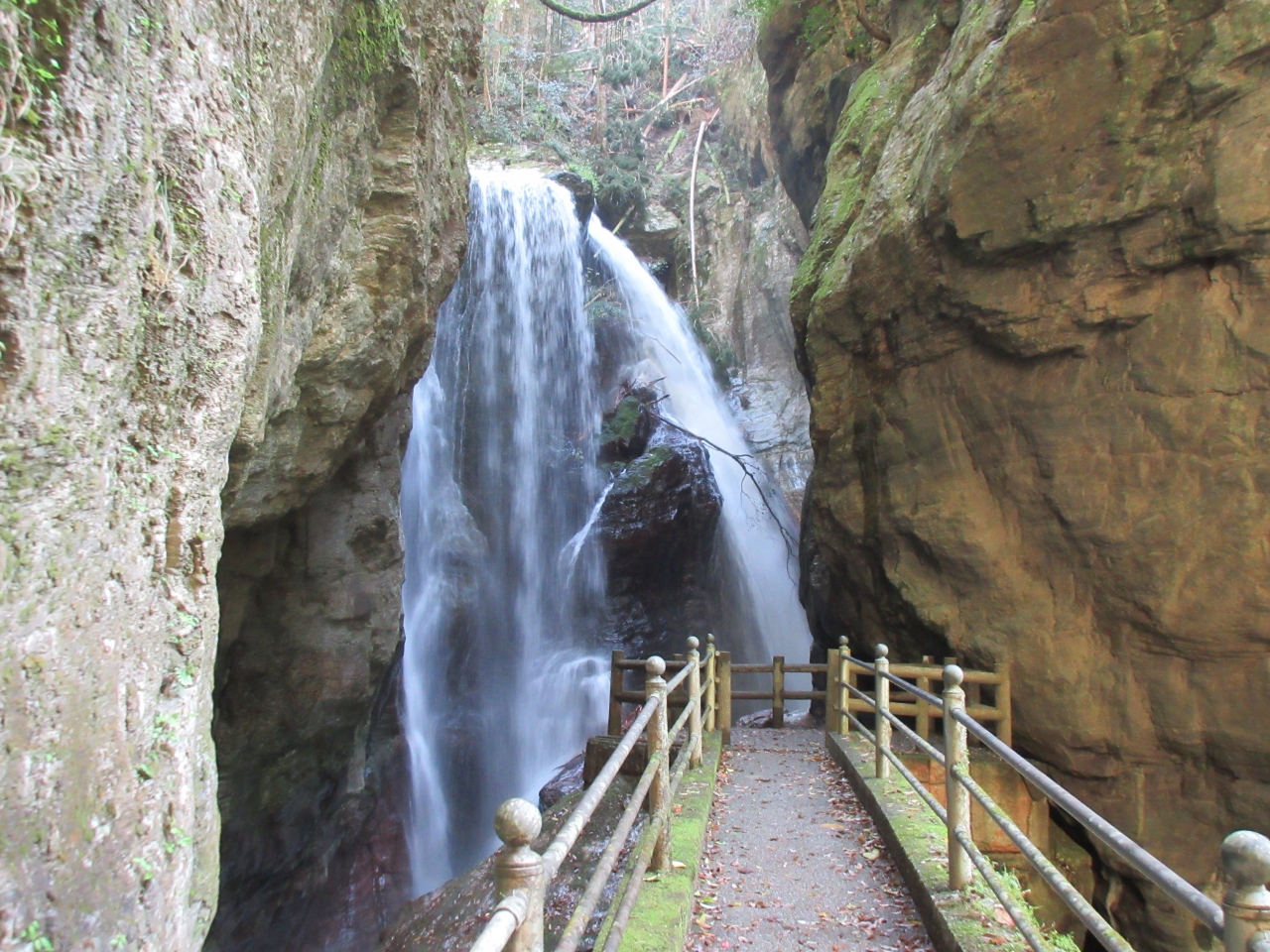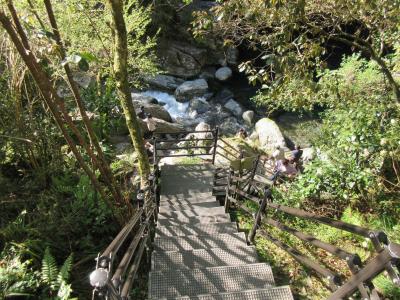 「にこ淵」の看板のところから、坂と階段を下って行きます。最初は緩やかですが、次第に階段が急になって、さらに手すりを持たないと怖いくらい急な階段になりました。