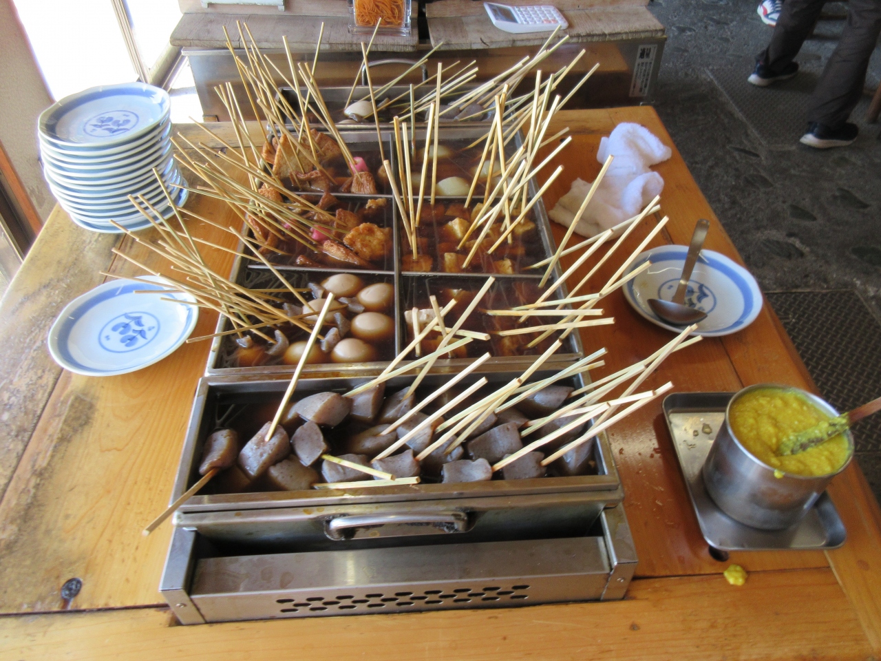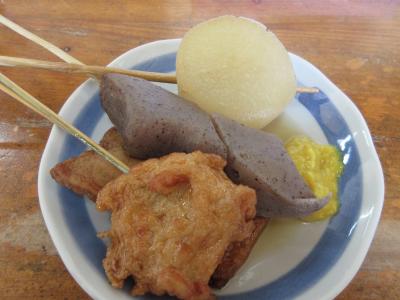 おでんはどれでも1本100円という安さ、あめごも大ぶりな形で500円という破格な値段です。味がよく浸みたおでん4本と、身が締まって味が濃いあめごでお腹が満たされました。