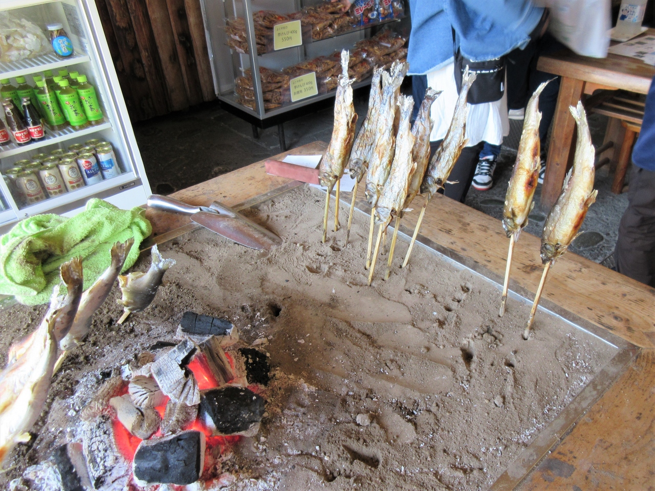 店頭でおでんを煮ていたり、アユやあめごを炭火で焼いているので、即決です。