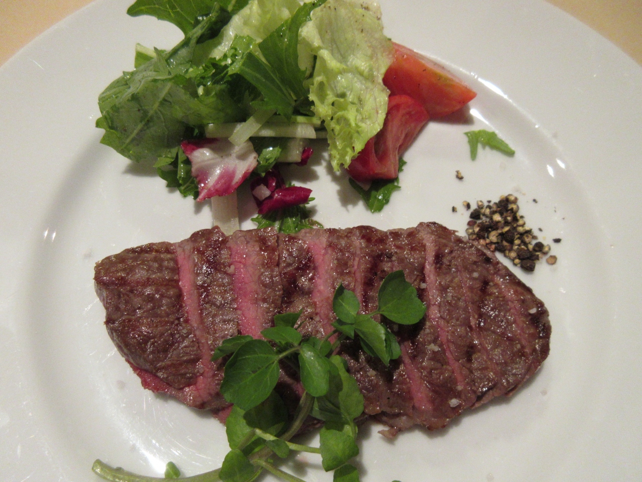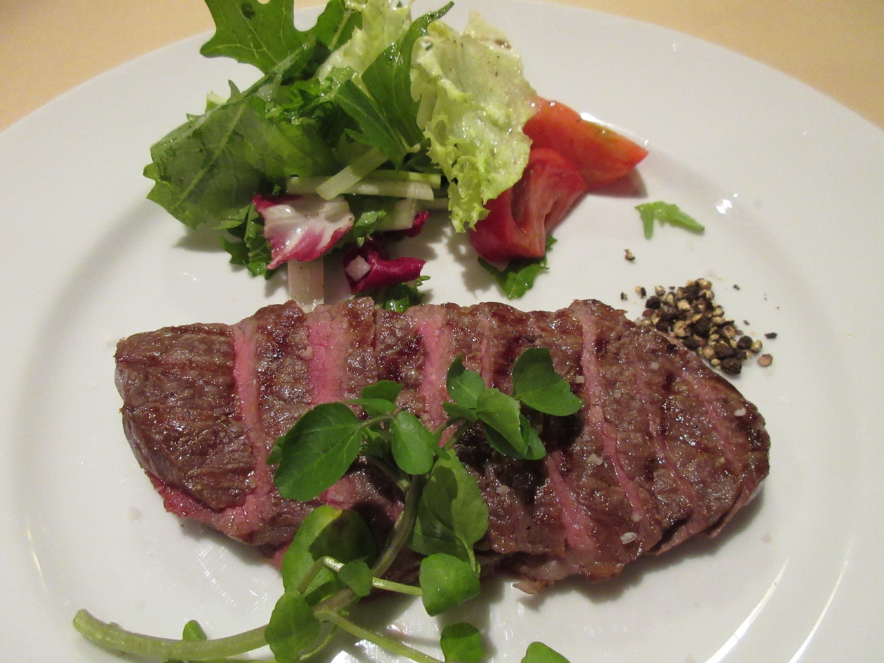 「土佐あかうし」のステーキとピザを赤ワインと一緒にいただきました。