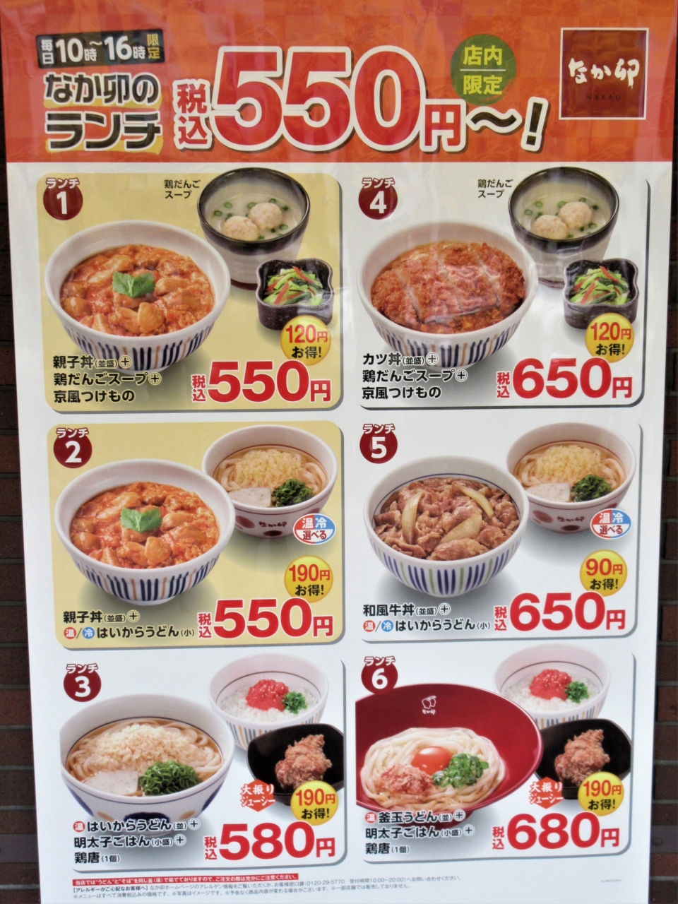 澄んだつゆの京風うどんが特徴で、丼とのセット物が人気のなか卯の『親子丼(並)+はいからうどん(小)』(550円)