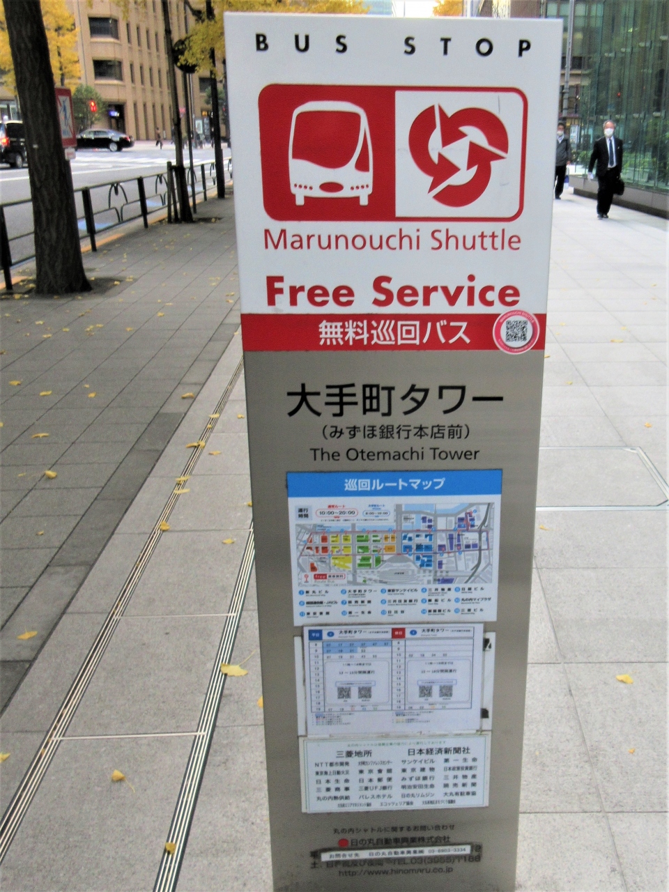 大手町タワー」のバス停から「通常コース」に乗って、ペニンシュラホテルの横バス停「日比谷」まで利用しました。車内はガラガラで、近隣オフィスの関係者やそこに用事のある人たちが乗り降りしている感じでした。- 旅行時期