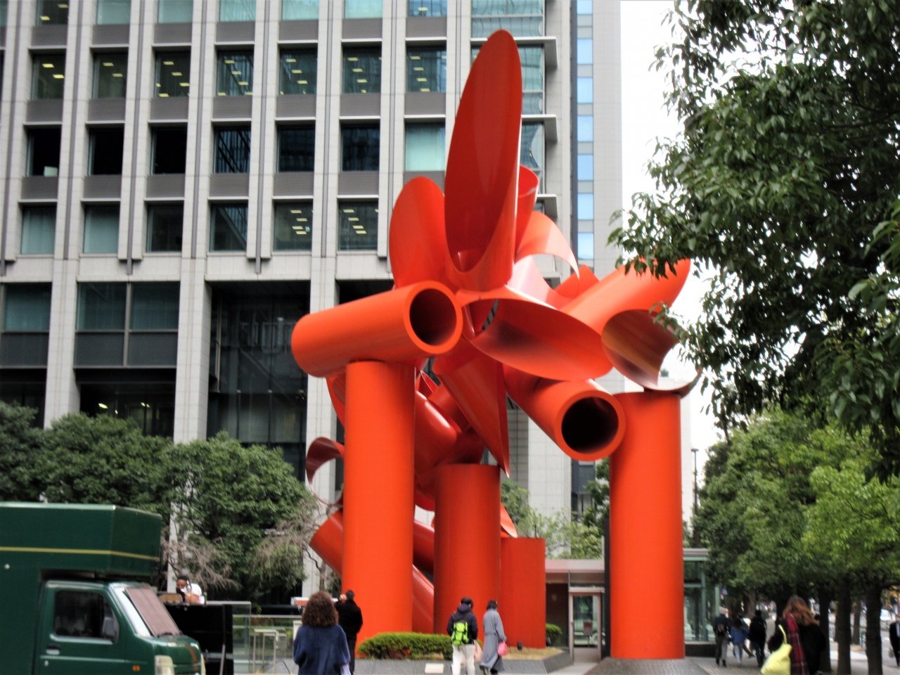 広場に赤いパイプのモニュメントがあります。- 旅行時期