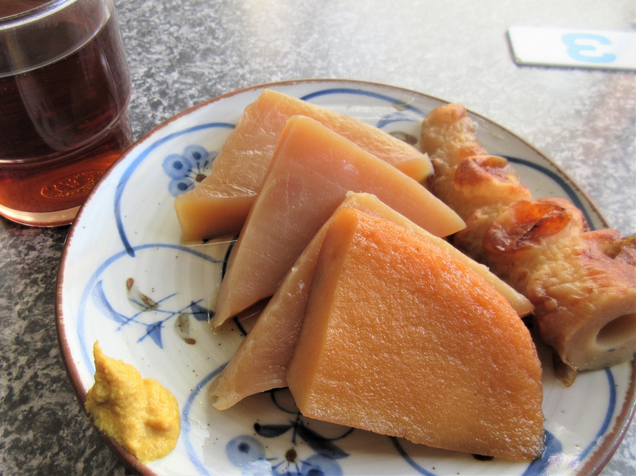 ここのおでんは、ホントに色が濃くて、こんにゃくがまるでさつま揚げ色をしています。味も浸みていますが、シャキシャキとした食感が良く、ここならではの味を楽しみました。