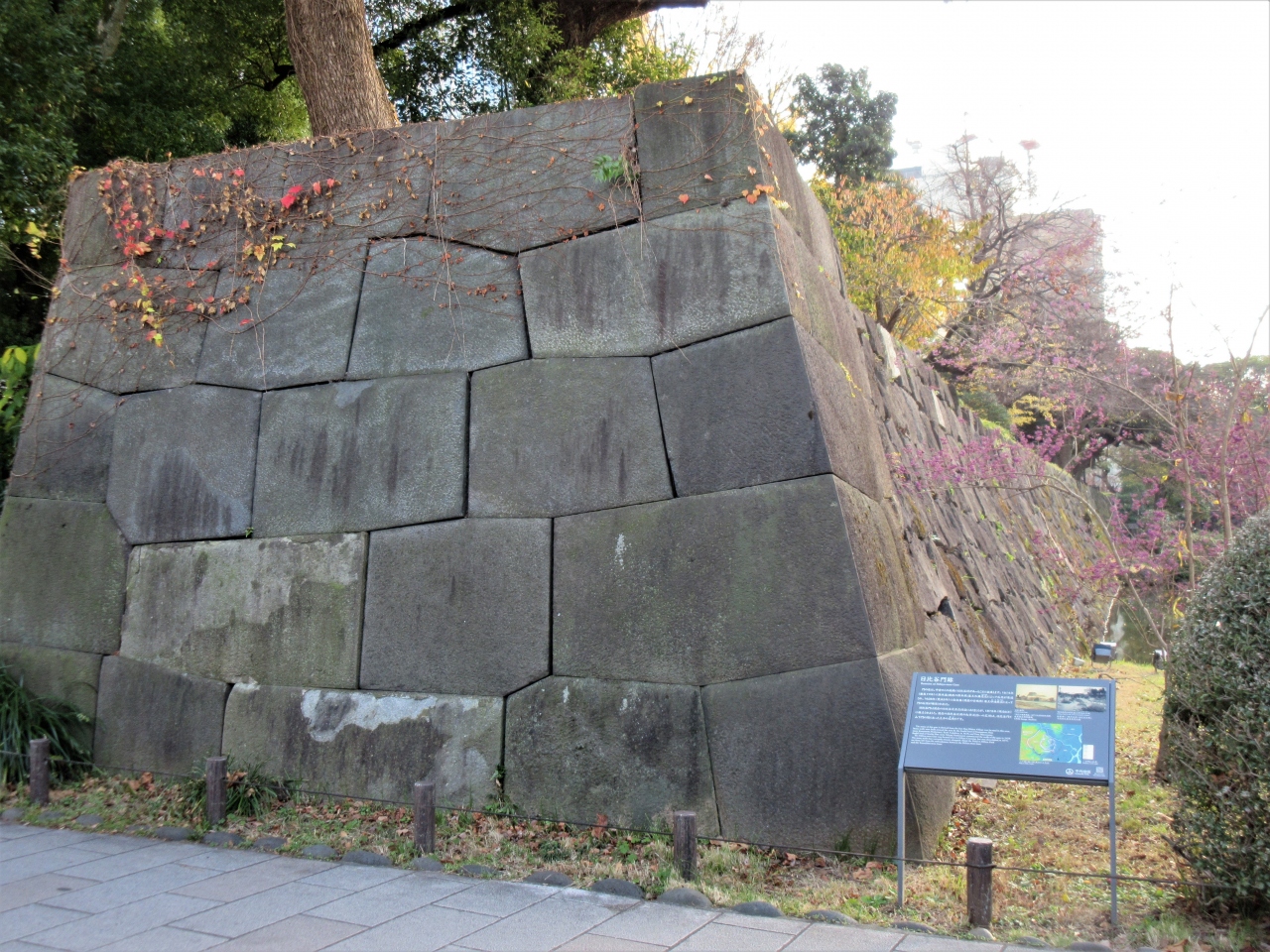 日比谷公園の入口(有楽門)から入ったすぐのところに石垣があります。この「日比谷見附跡」は、江戸城警備のための城門(見附)のひとつだったことが残されています。