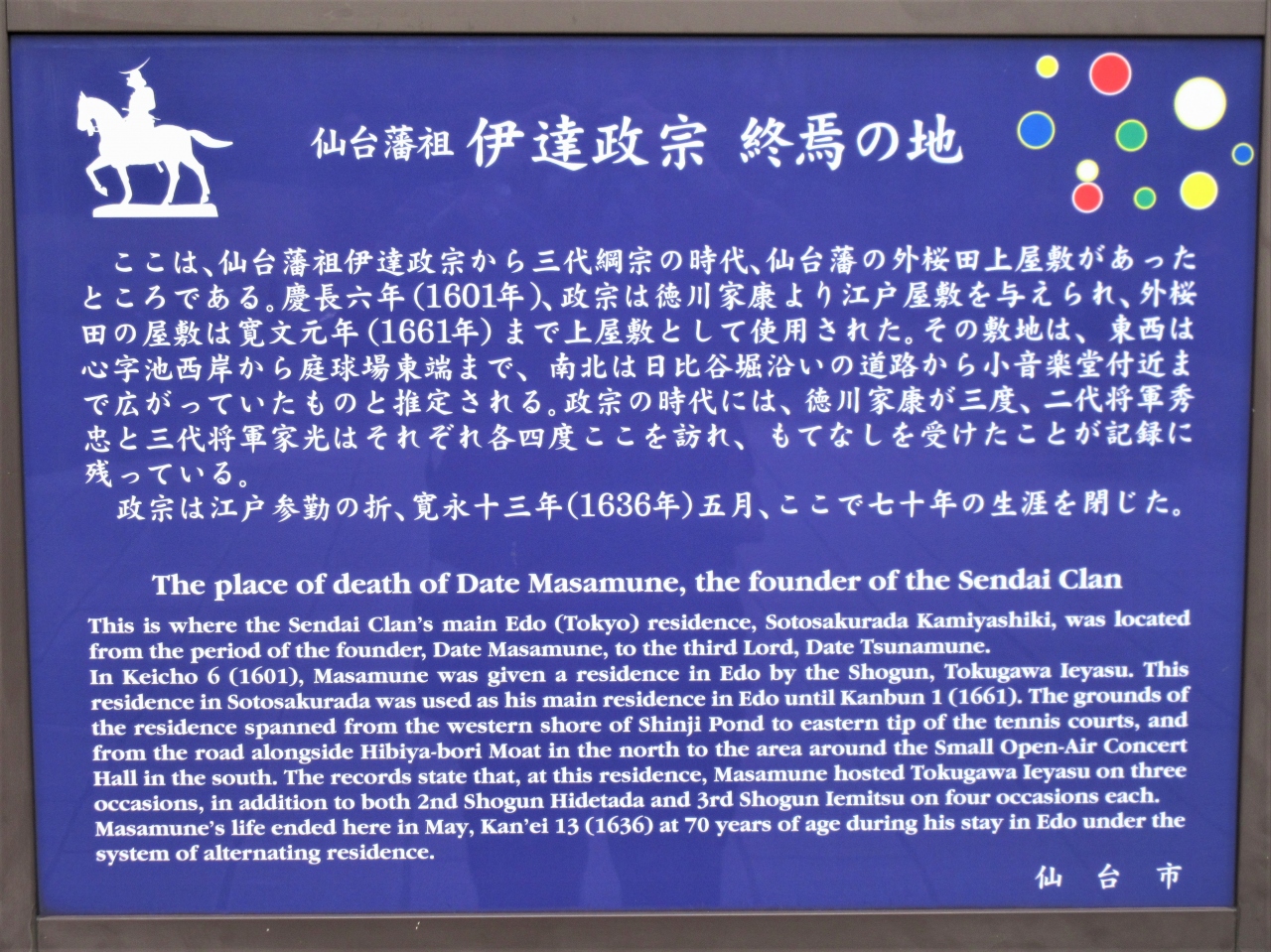 1601年、徳川家康から江戸屋敷を与えられて、1661年までここに、伊達家の上屋敷(外桜田上屋敷)があったそうです。