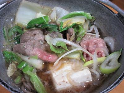 夕食は、ハーフバイキングで、事前に『牛すき鍋』『刺身4点盛り』がセットされています。他にバイキング料理が20種類くらいに、ソフトドリンクが10種類くらい。アルコールが1杯好きな物を飲めます。