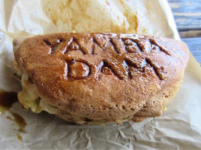 農産物直売所の奥で、焼いて作っている『ダム焼き』(280円)には、『小倉あん』『カスタード』『キャベツ&ベーコン』の3種類があります。『キャベツ&ベーコン』をいただきました。皮はお好み焼きというより薄くて柔らかいカステラ生地のような食感です。