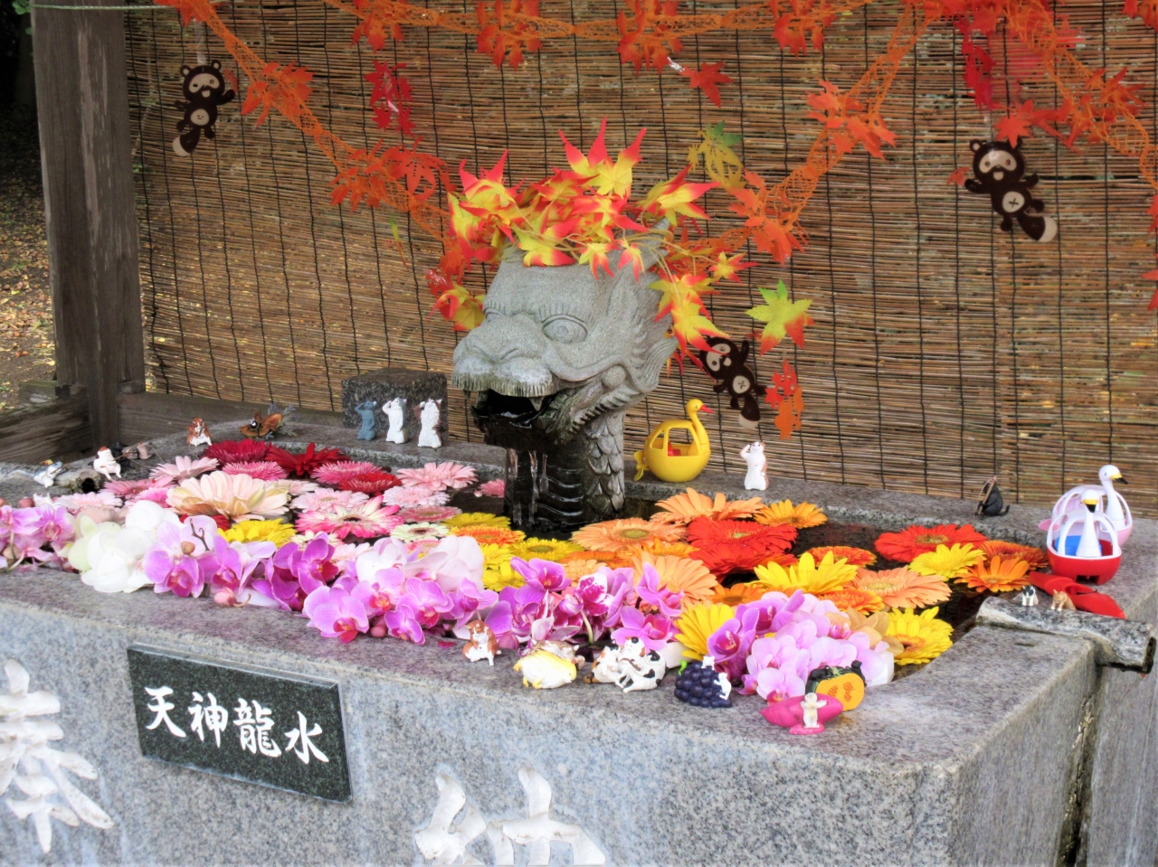 伊勢神宮の御分霊が祀られた神社で、いつも綺麗な花で「龍の花手水」が見られます。今回は七五三バージョンでした。