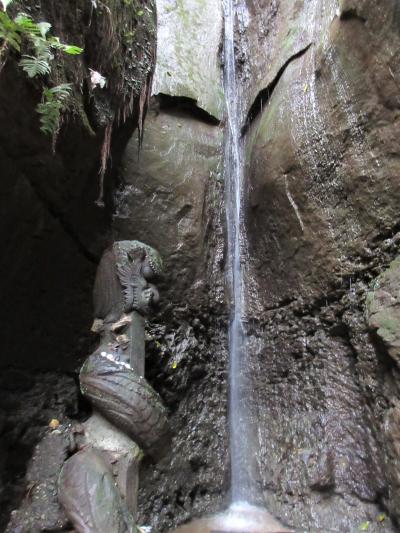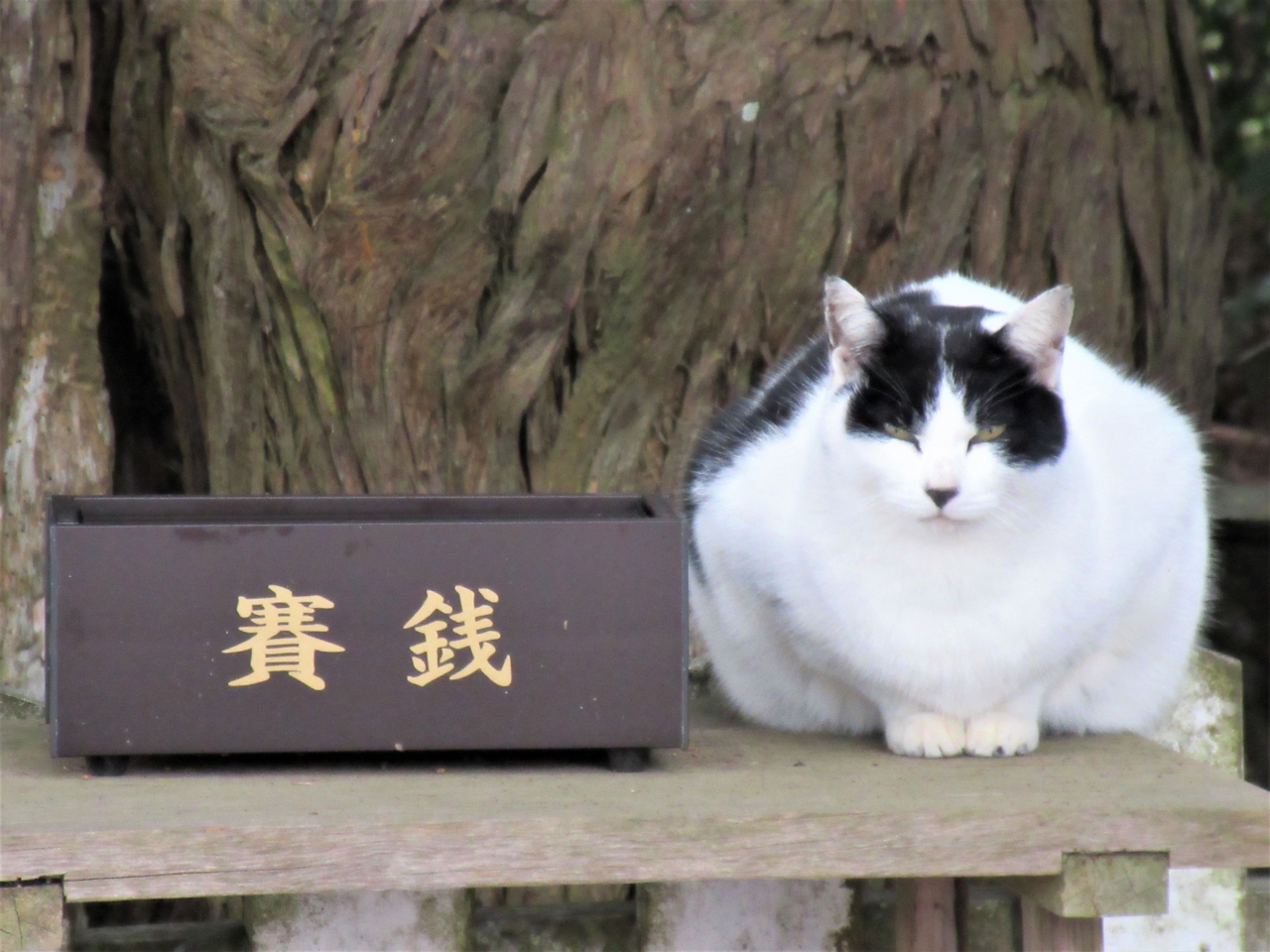 樹齢約320年も夫婦杉には、にゃんこが賽銭箱の見張り番をしていました。