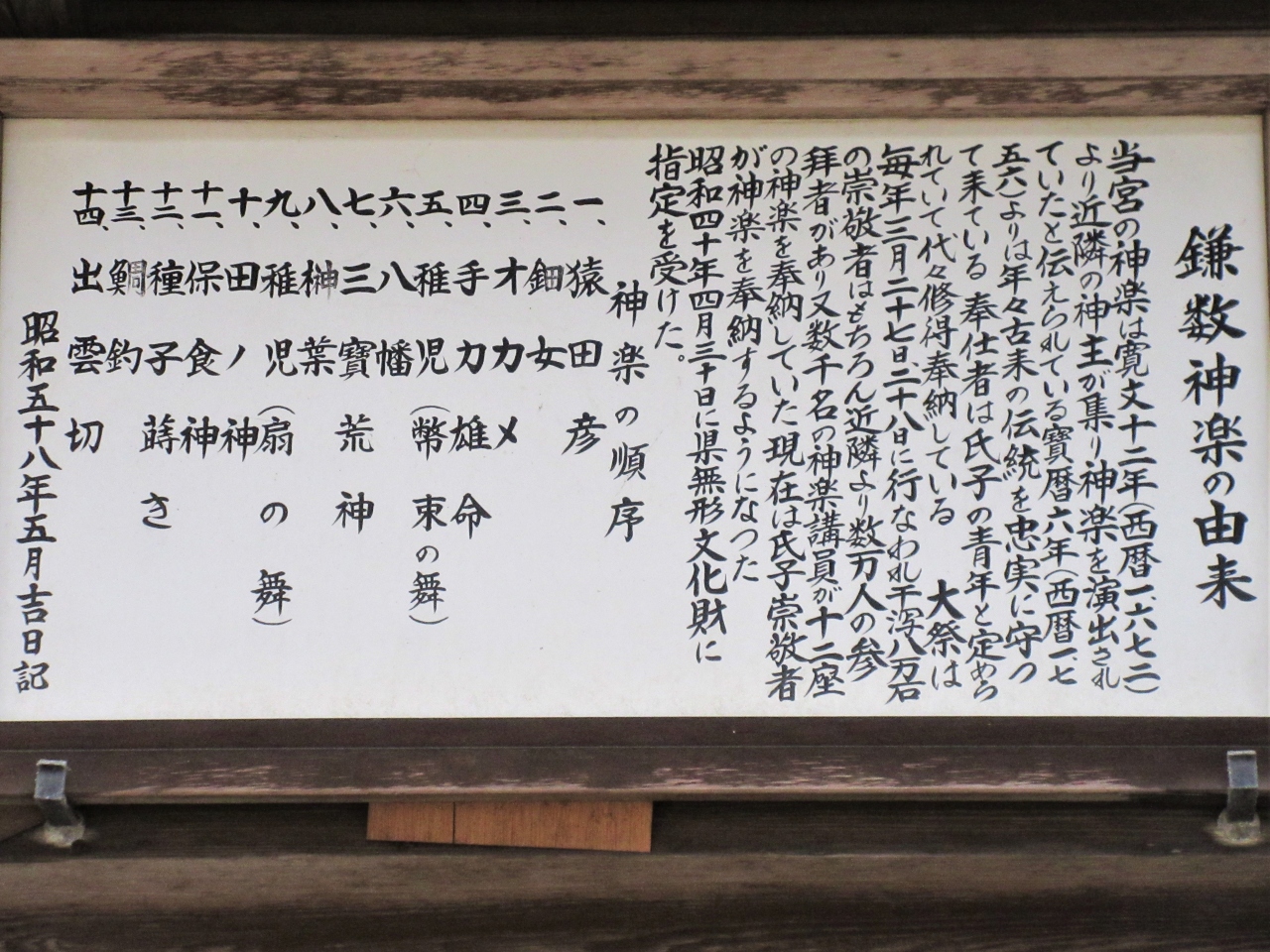 神楽殿では、毎年3月の「春の祭礼」で、江戸中期の1756年から続く岩戸神楽や五穀豊穣祈願舞が奉納されるのですが、残念ながら今年も式典のみで神楽奉納はお預けに。来年こそは実施視されることを祈ります。- 旅行時期