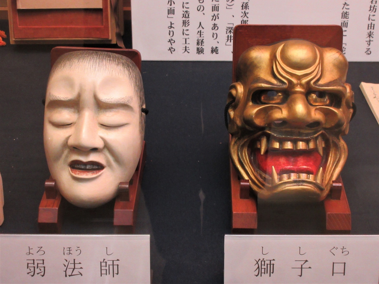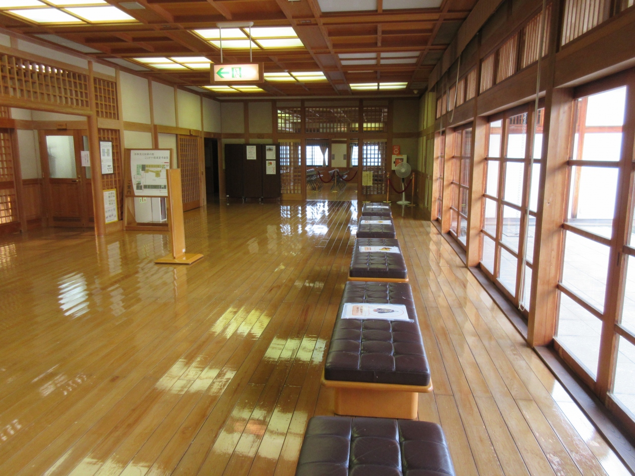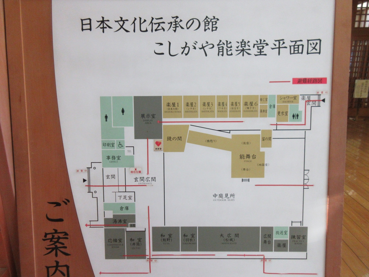 能楽堂のロビーと、その奥の展示室が自由に見学が出来ます。展示室には、装束、面、鼓、扇、能舞台の各名称を記した図など、様々な資料がありました。