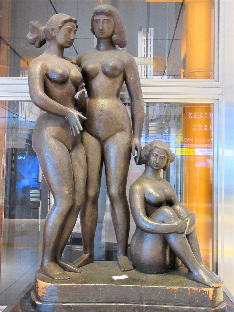 八重洲中央通路のエレベーター脇にある大きな女性3人の彫刻、圓鍔勝三(えんつばかつぞう)作『仲間』という作品です。一見金属のように見えますが、実は木彫です。