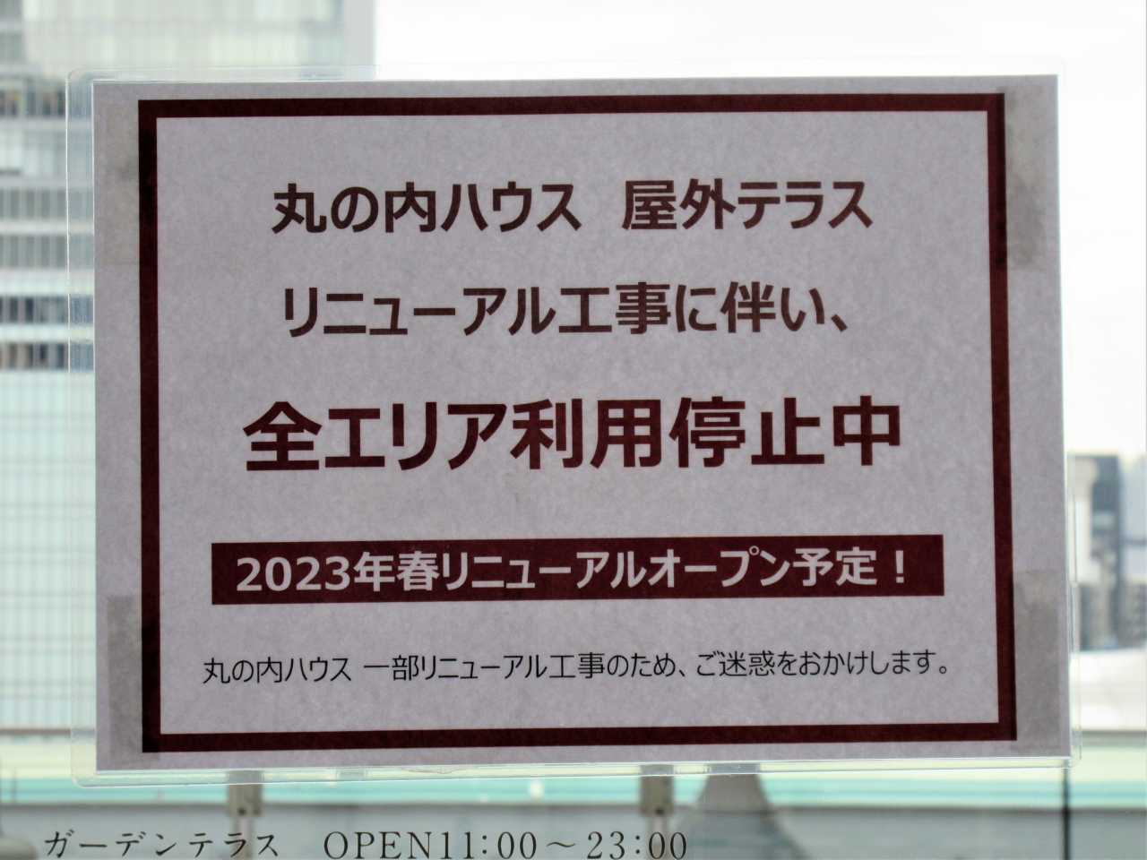 7階の展望フロア「marunouchi HOUSE」に行くと、テラスへの出入り口に貼り紙がありました。屋外テラスは来春までの全面工事中でした。