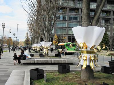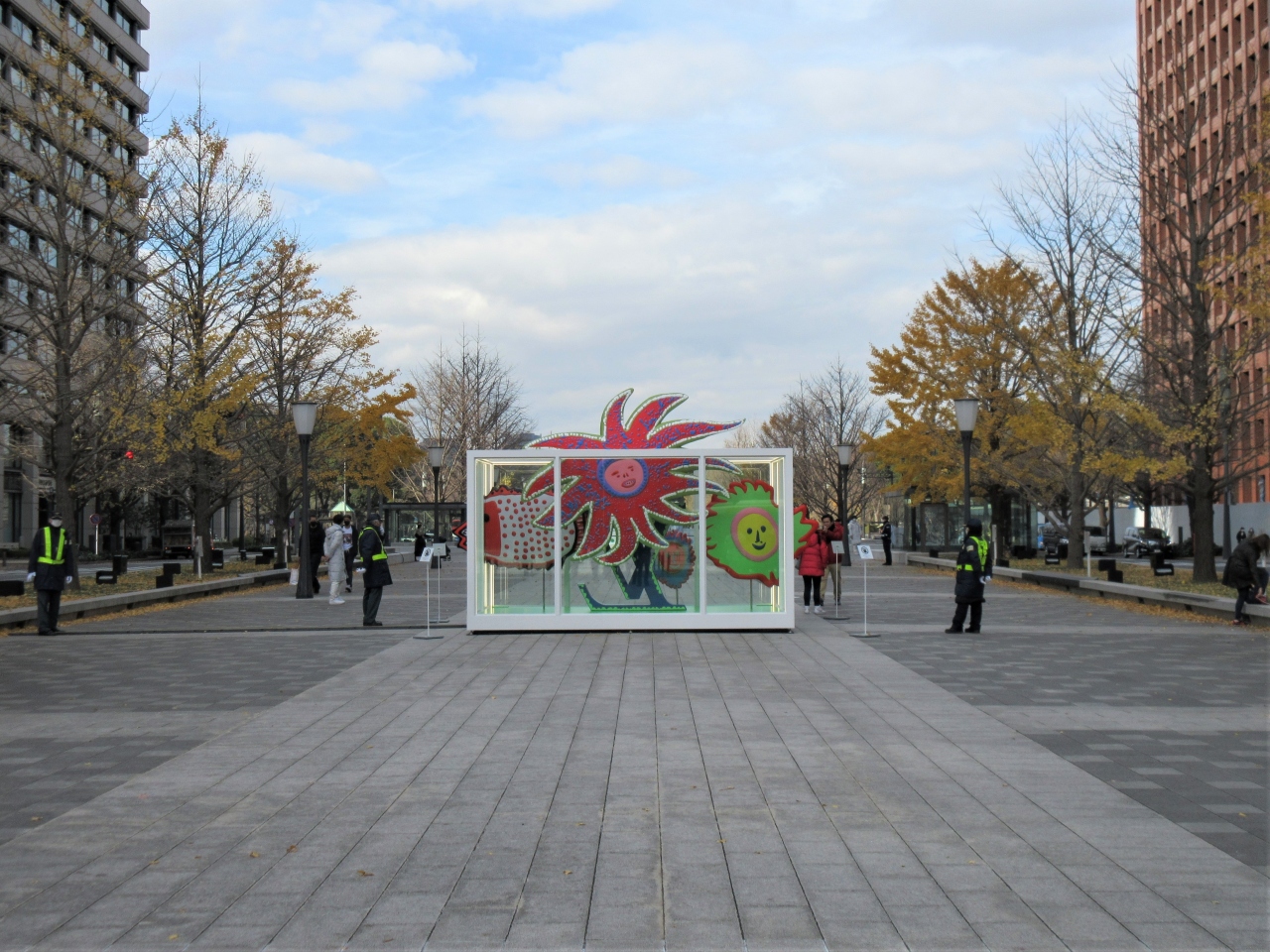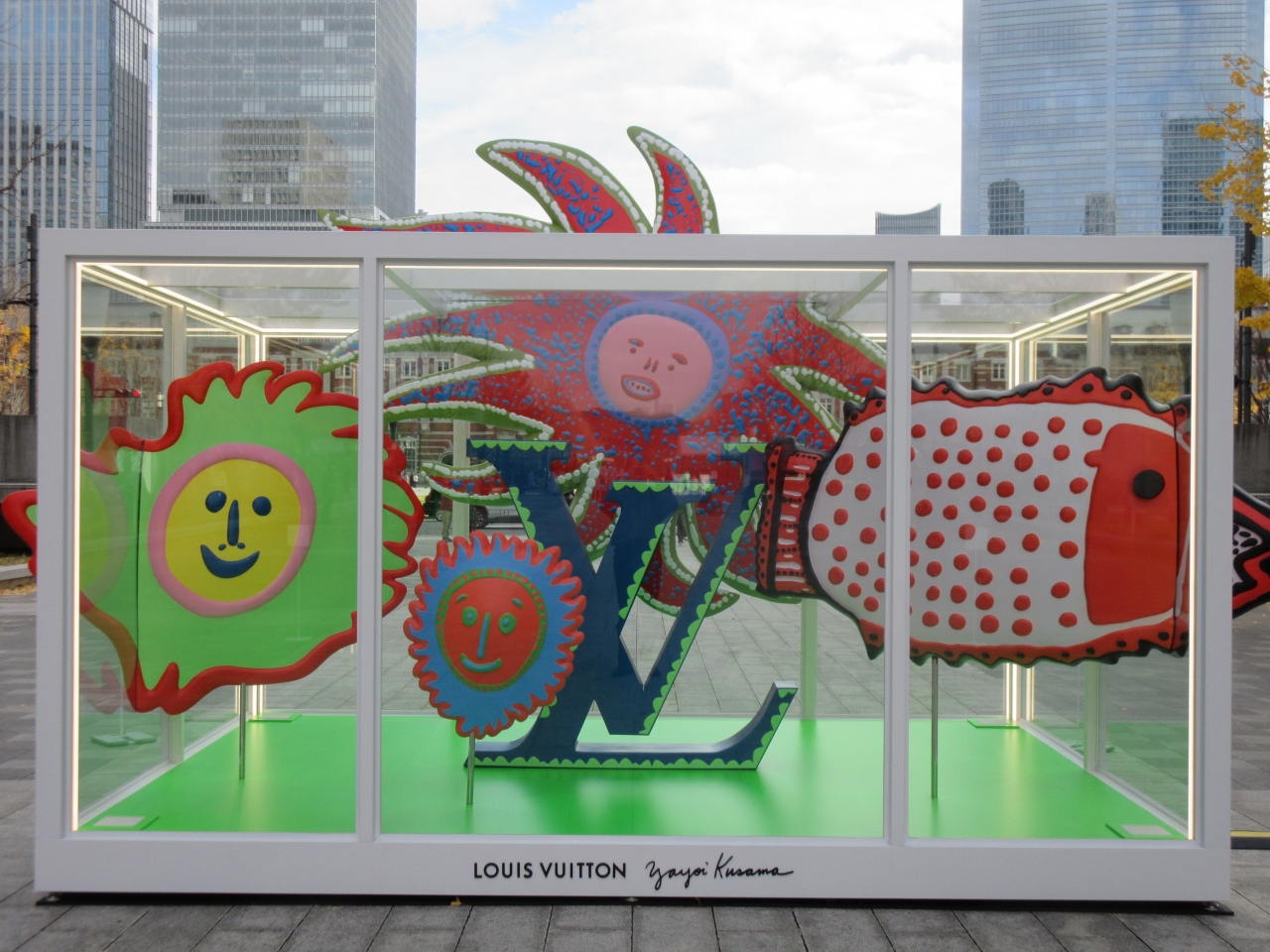 遊歩道の中央に、何やら大きなアートらしき物が建っていて、四方を警備員が囲っていました。『Louis Vuitton×草間彌生のコラボ作品』でした。水玉模様があしらわれていました。