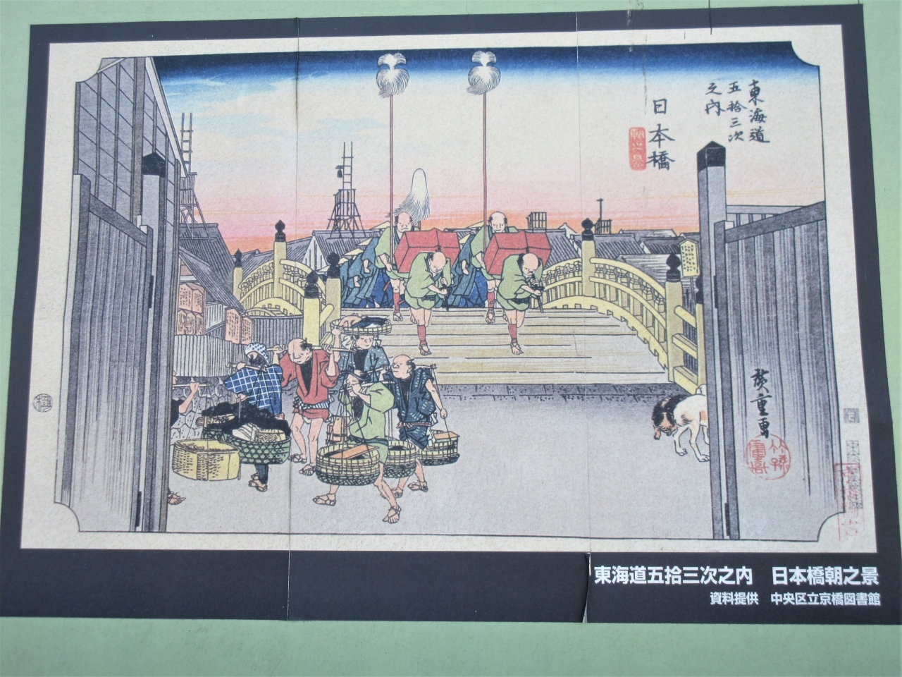 浜町公園付近の休憩スペースでは、壁面に浮世絵が描かれていました。