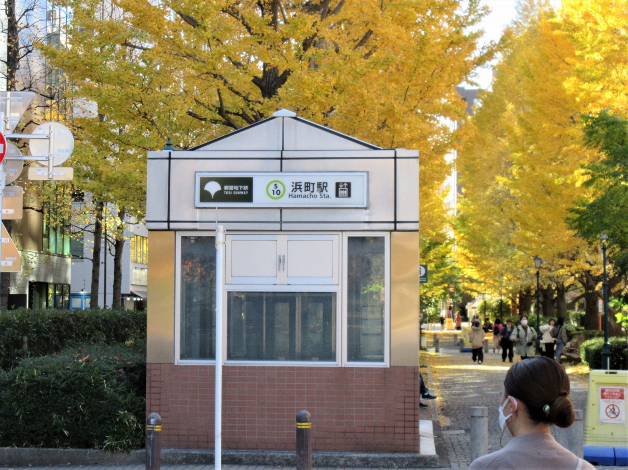また、浜町公園の一部「イチョウ並木」の端にあるので、秋は、イチョウ並木の黄葉目的で来るにも便利です。並木の前に明治座入口があるので、観劇の際もこの駅が一番近いです。