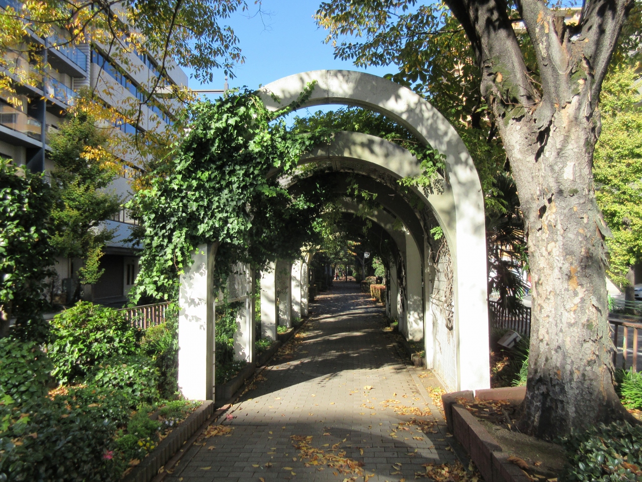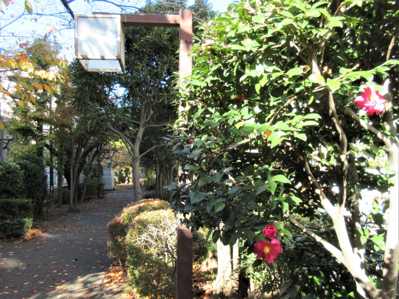 甘酒横丁と交差する遊歩道で、とても静かな空間です。植物が多くて、四季折々に花が咲いて楽しめます。