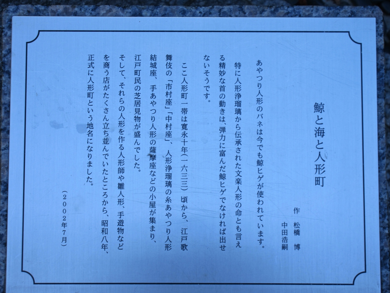 人形浄瑠璃の文楽人形の仕掛けに使われるバネは、今でも鯨ヒゲが使われているという、縁があるのでこの石碑を作ったようです。