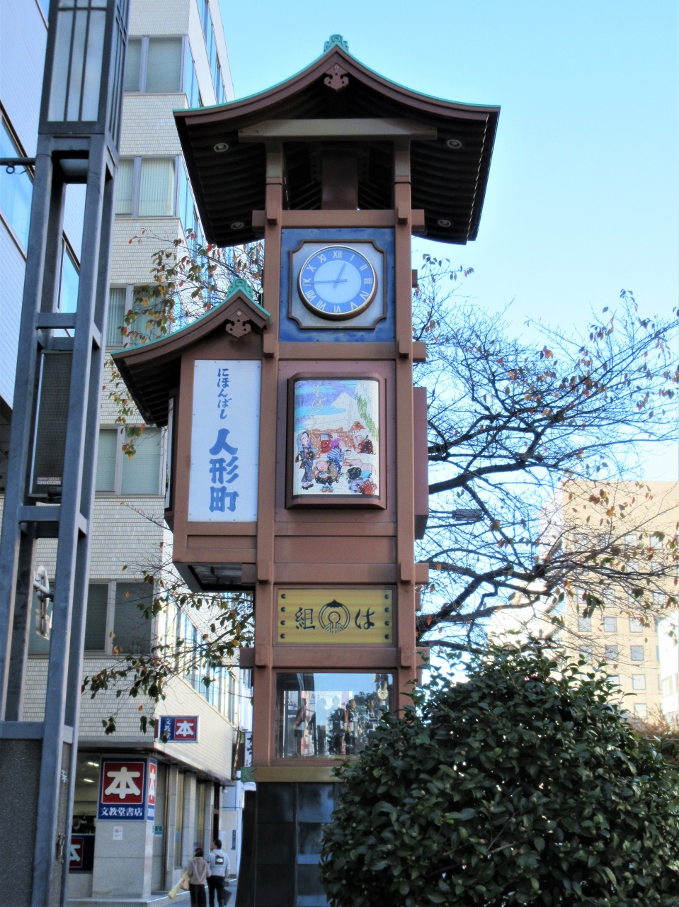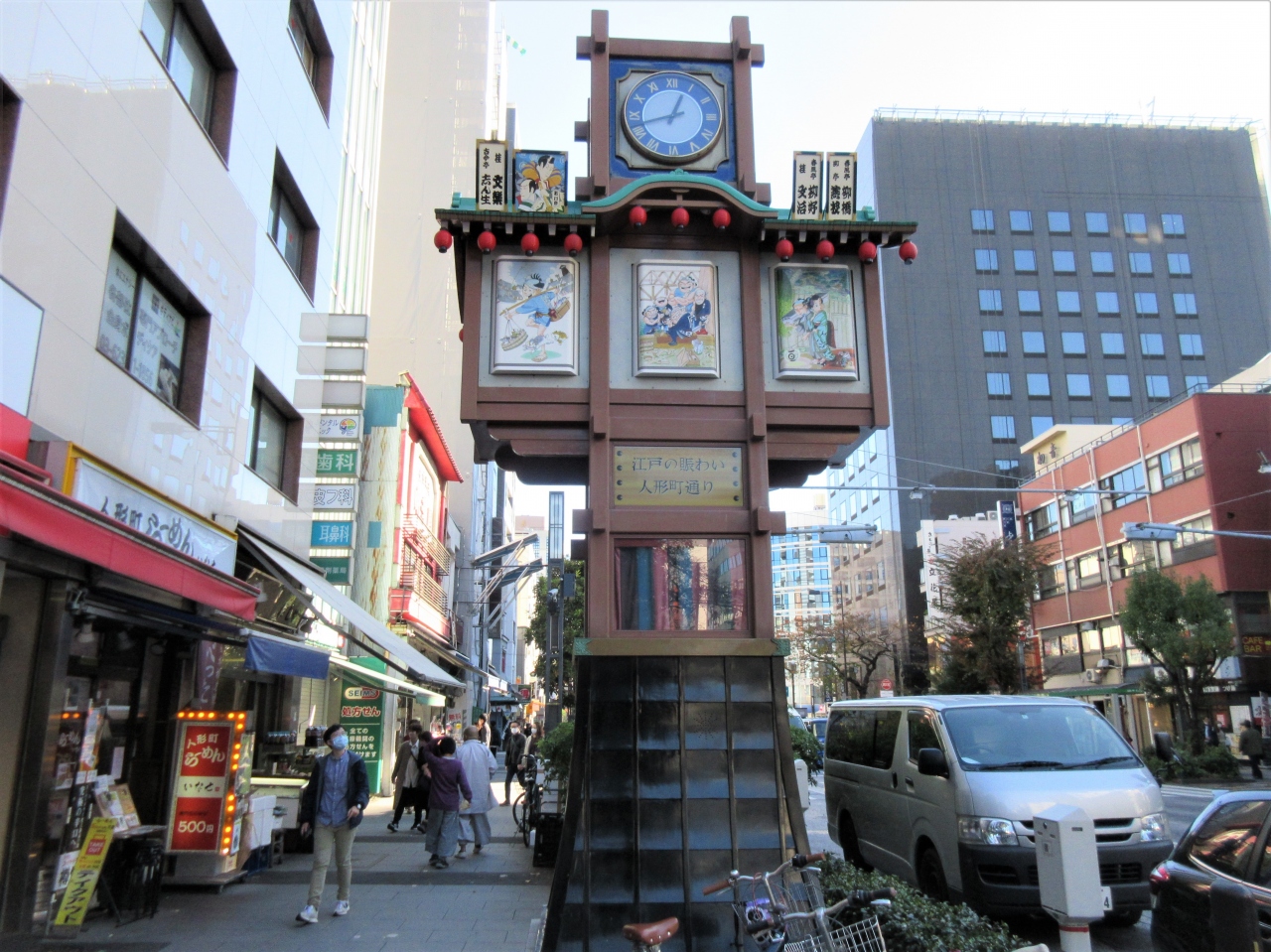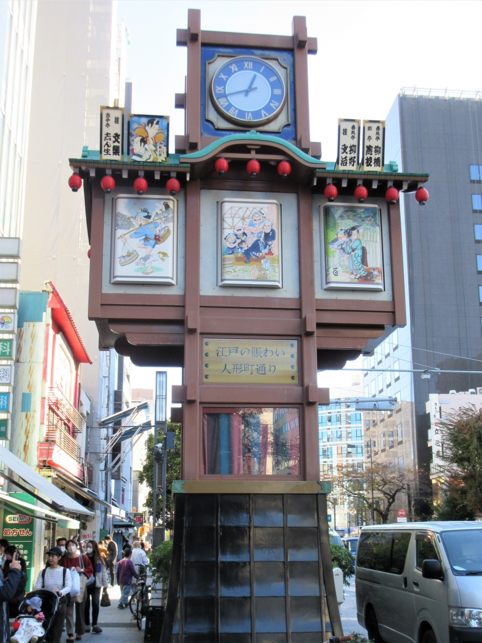 人形町通りの歩道に、『江戸落語』と『町火消しからくり櫓』という、2つの大きなからくり時計の「からくり櫓」があります。