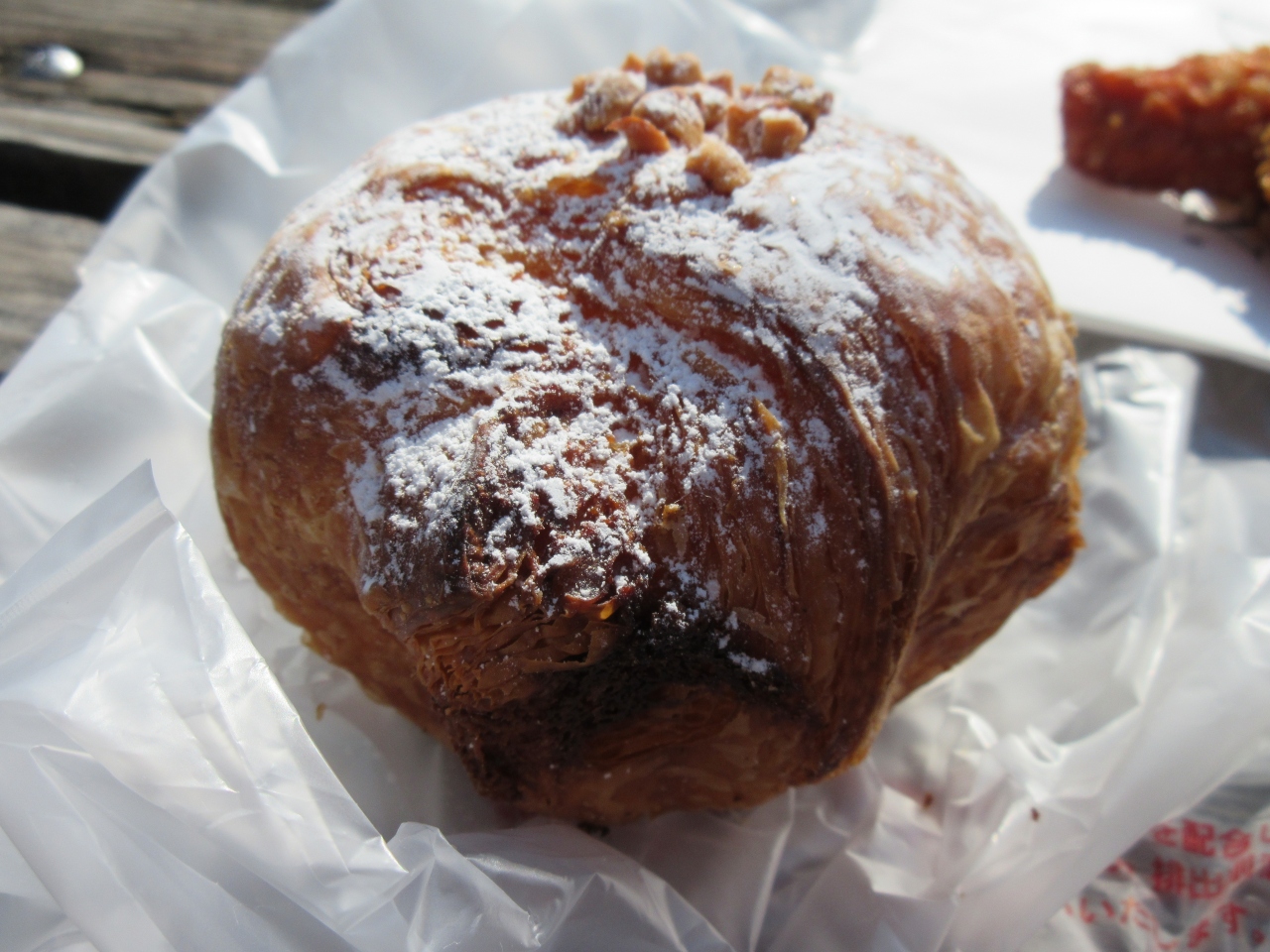 アーモンドケーキをクロワッサンの生地で包んで、そぼろ状にしたクッキーと砕いたアーモンドをのせて焼いたもの。