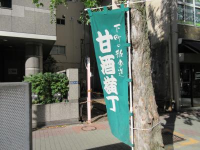 甘酒横丁と交差する場所には「弁慶像」が立っています。なぜかと思ったら、350年前のこの街に市村座と中村座の2座があって、歌舞伎を上演していたからだそうです。また浄瑠璃人形の芝居小屋も数件あったらしい。