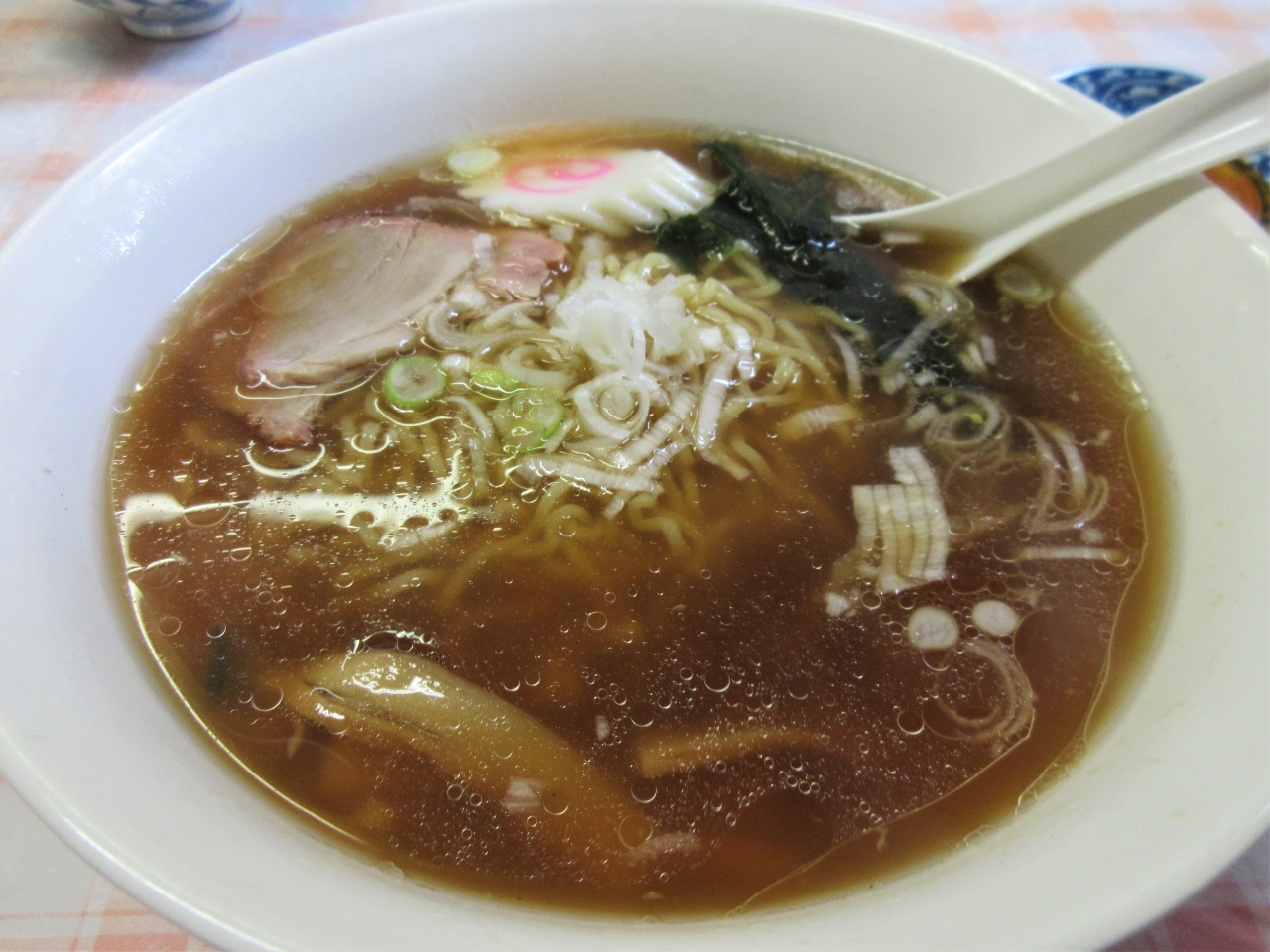ラーメンは、醤油ベースのスープにチャーシュー、シナチク、ナルト、ワカメ、長ネギが乗っています。昔ながらの中華そば風ですが、中太縮れ麺がどっしりとした食べ応えを感じさせます。
