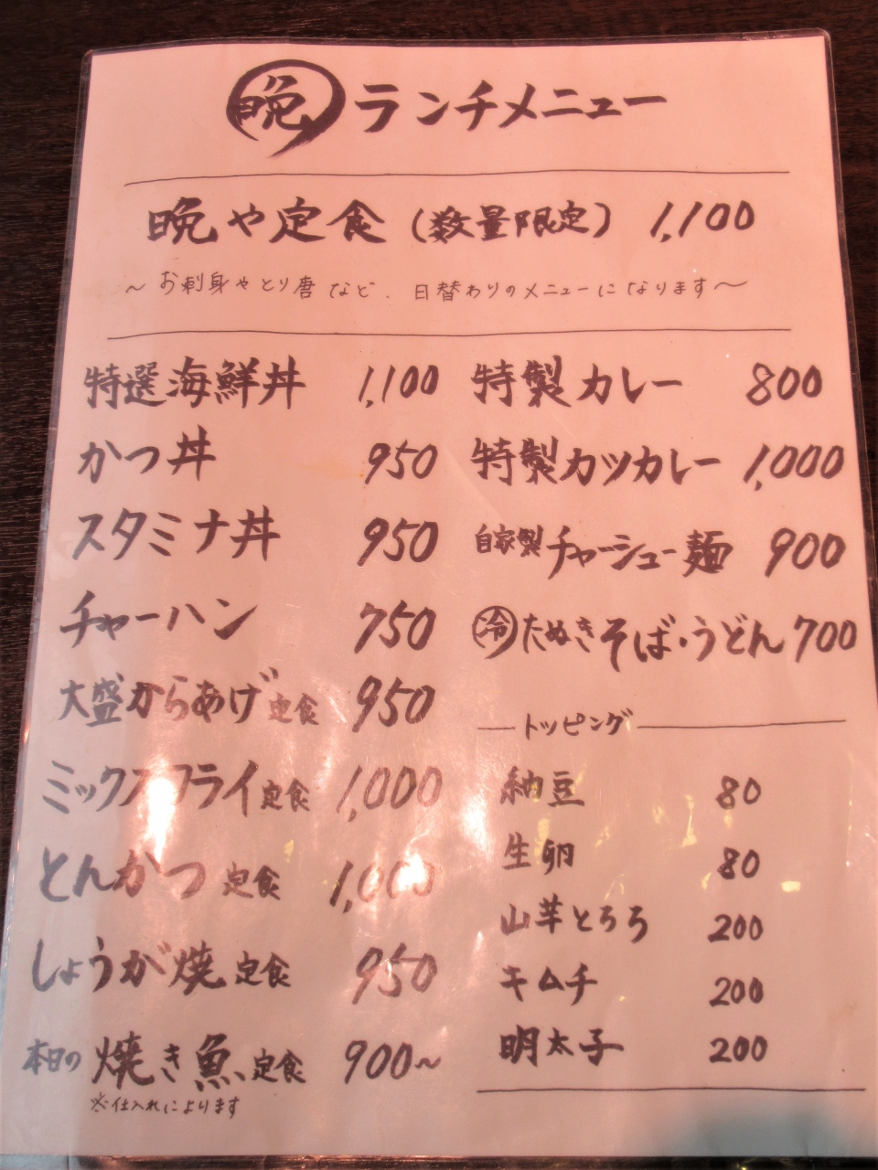 数量限定の『晩や定食』には、刺身盛り合わせ、鶏の唐揚、煮物、味噌汁とご飯が付くということでした。