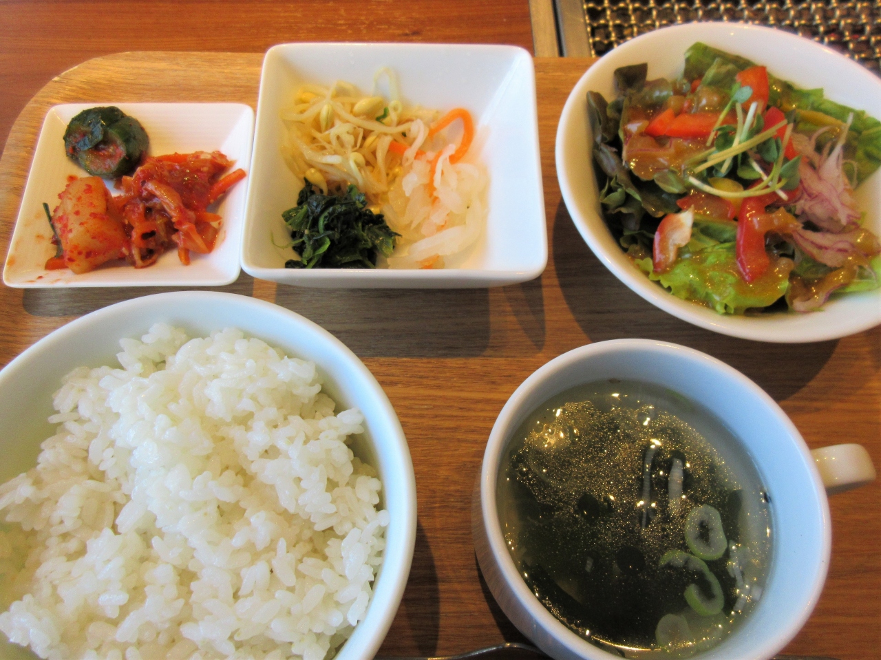 サラダ、キムチ、ナムル、スープが、お代わり無料のご飯につきます。
