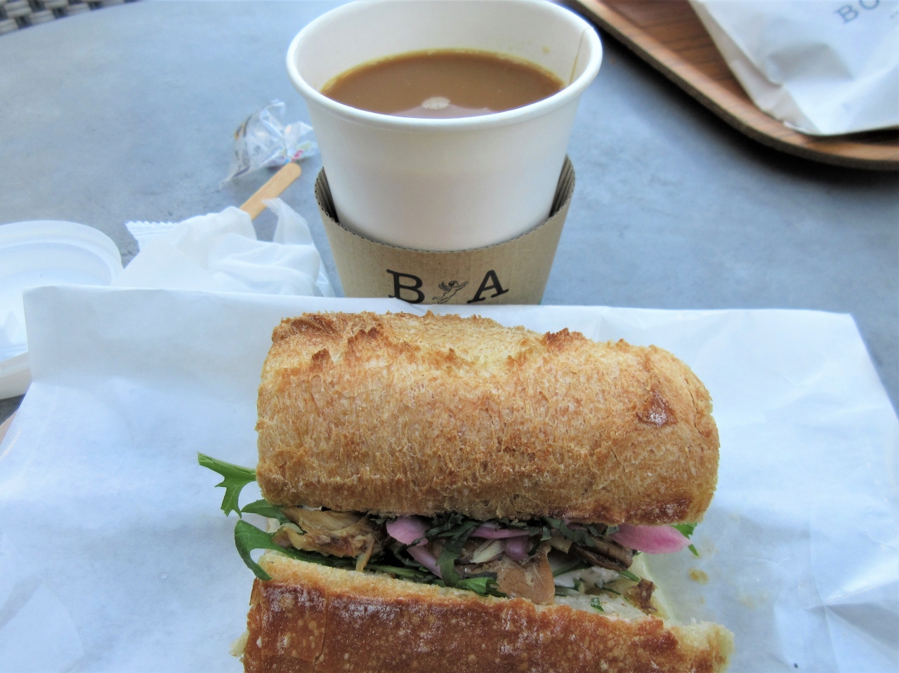 私はサバサンドとホットコーヒー。歯ごたえのあるフランスパンにサバや柴漬け、サラダが挟んであって、食べ応えもありました。
