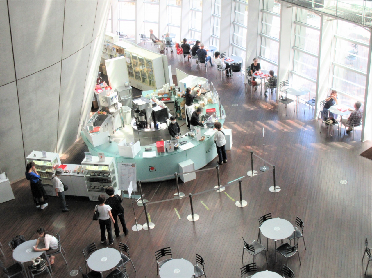 その波打つガラスのカーテンウォールを「『貝(コキーユ(仏語)』と表現して名付けたカフェで、美術館に入場しなくても利用できます。