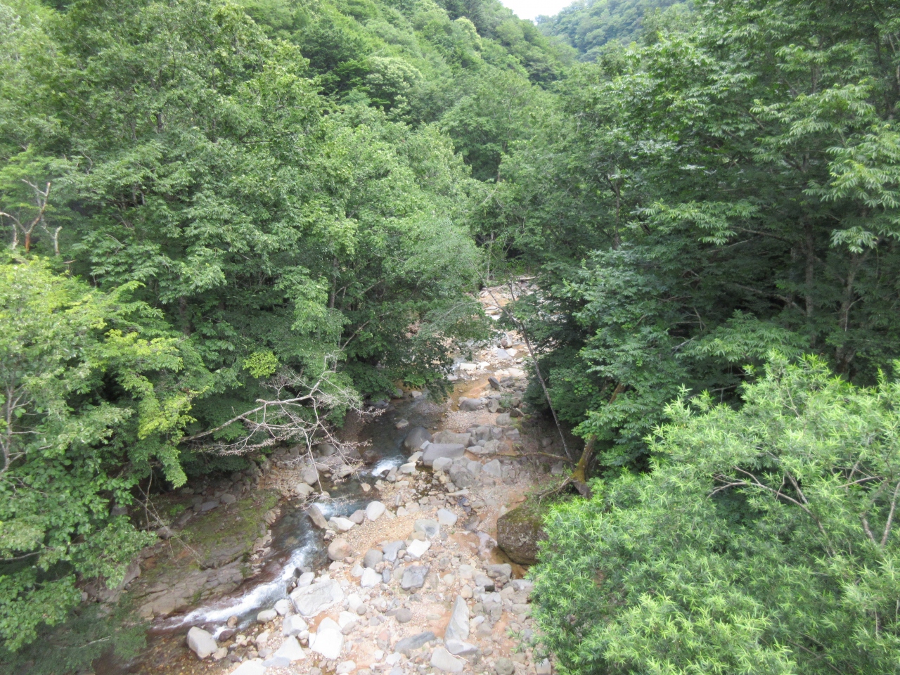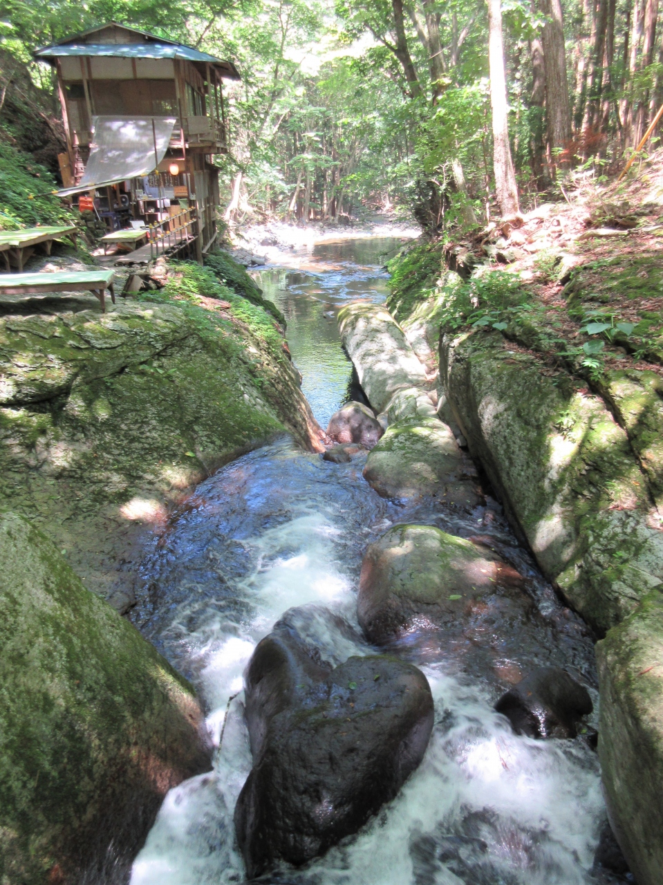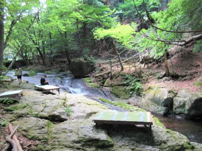 緑が茂った渓谷で、水の流れを見ているだけでも涼をとれます。急流沿いの岩にいくつもの縁台があってそこに座って眺めたくなります。