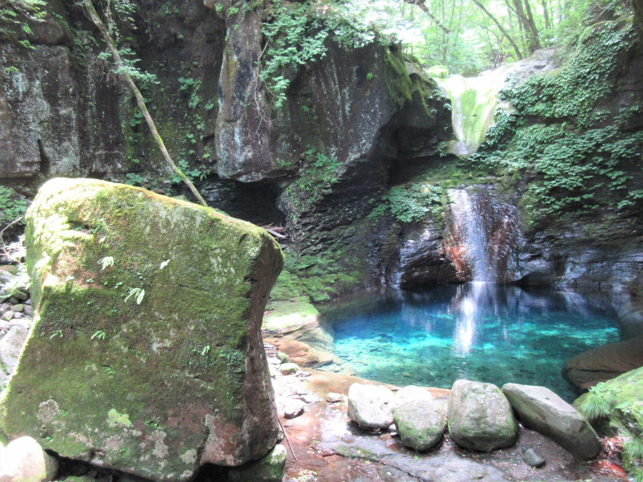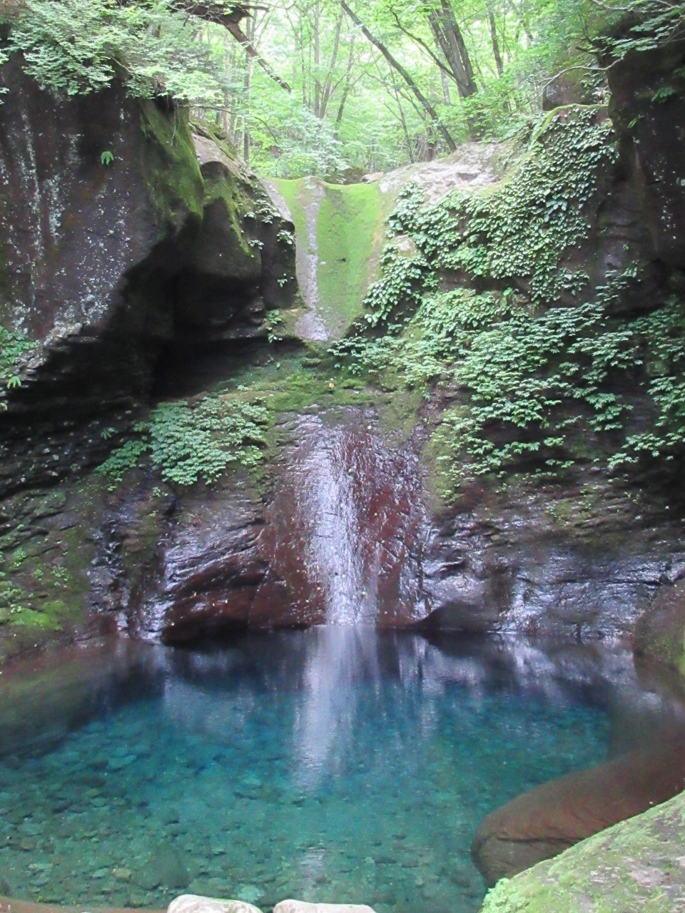 雨が降った後しか滝の水はあまり流れなくて、チョロチョロ岩伝いに流れ落ちるだけです。でも、深くて、透明度が高い滝壺の色はエメラルドグリーンというか「おしらじブルー」というらしいですが、神秘的です。「生きていることに感謝」という気持ちにさえなりました。