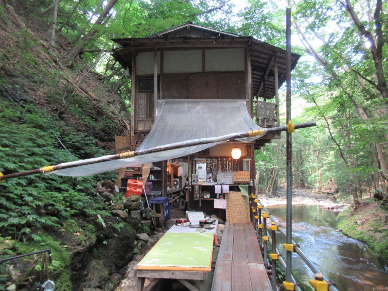 急流沿いの岩にいくつもの縁台があってとても良いポジションですが、それは全て小太郎茶屋のものなので、草だんごやおでんなどを注文して、縁台を利用することになります。
