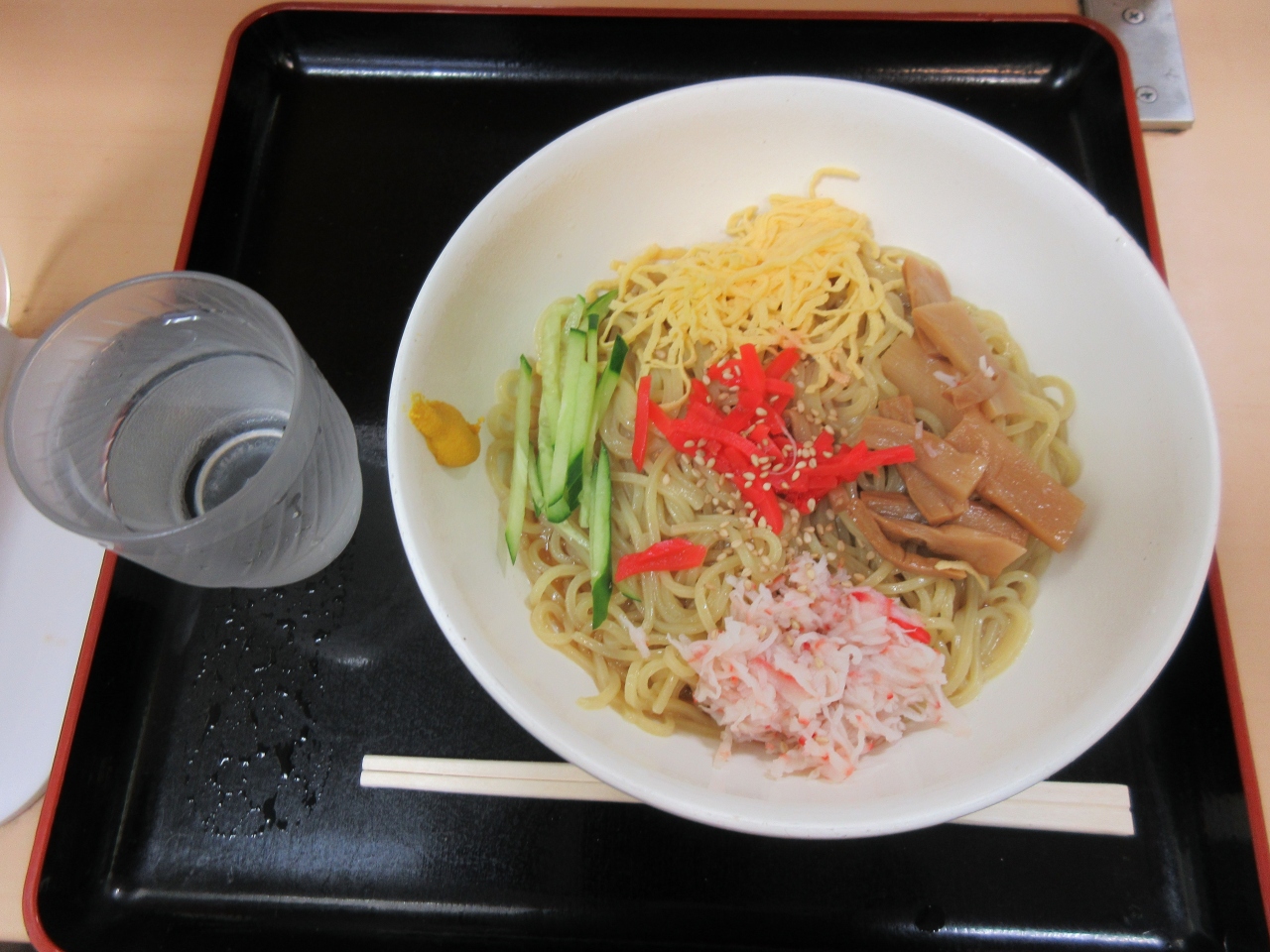 おそば用のどんぶりに入っていて、冷たく冷えた中華麺の歯ごたえとのどごしが良いです。具は、錦糸玉子、カニカマ、キュウリ、シナチク、紅ショウガの5種類です。