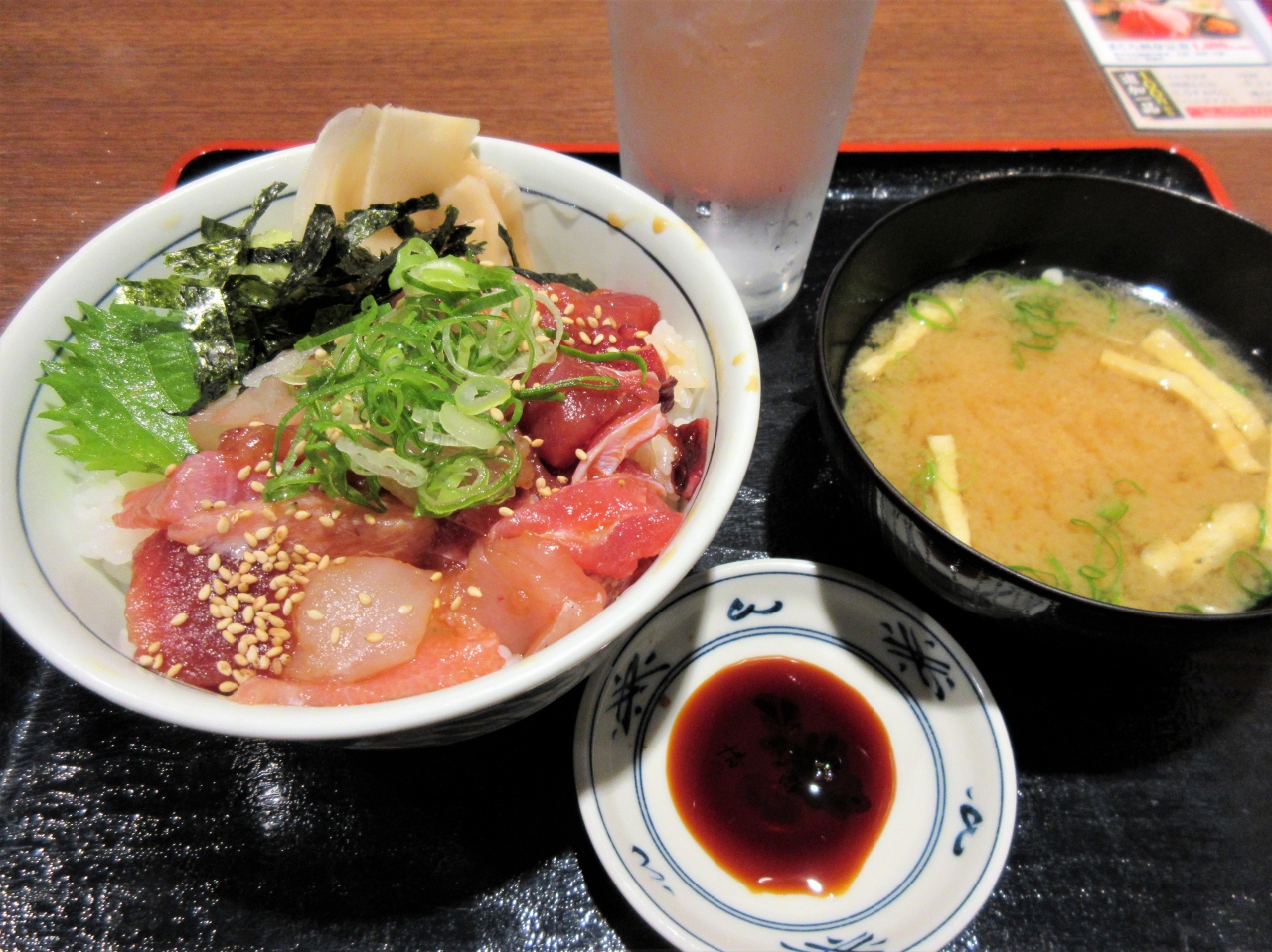 3種類の日替わりランチから『海鮮漬け丼』を選びました。大盛りと味噌汁のお代わりは無料です。
