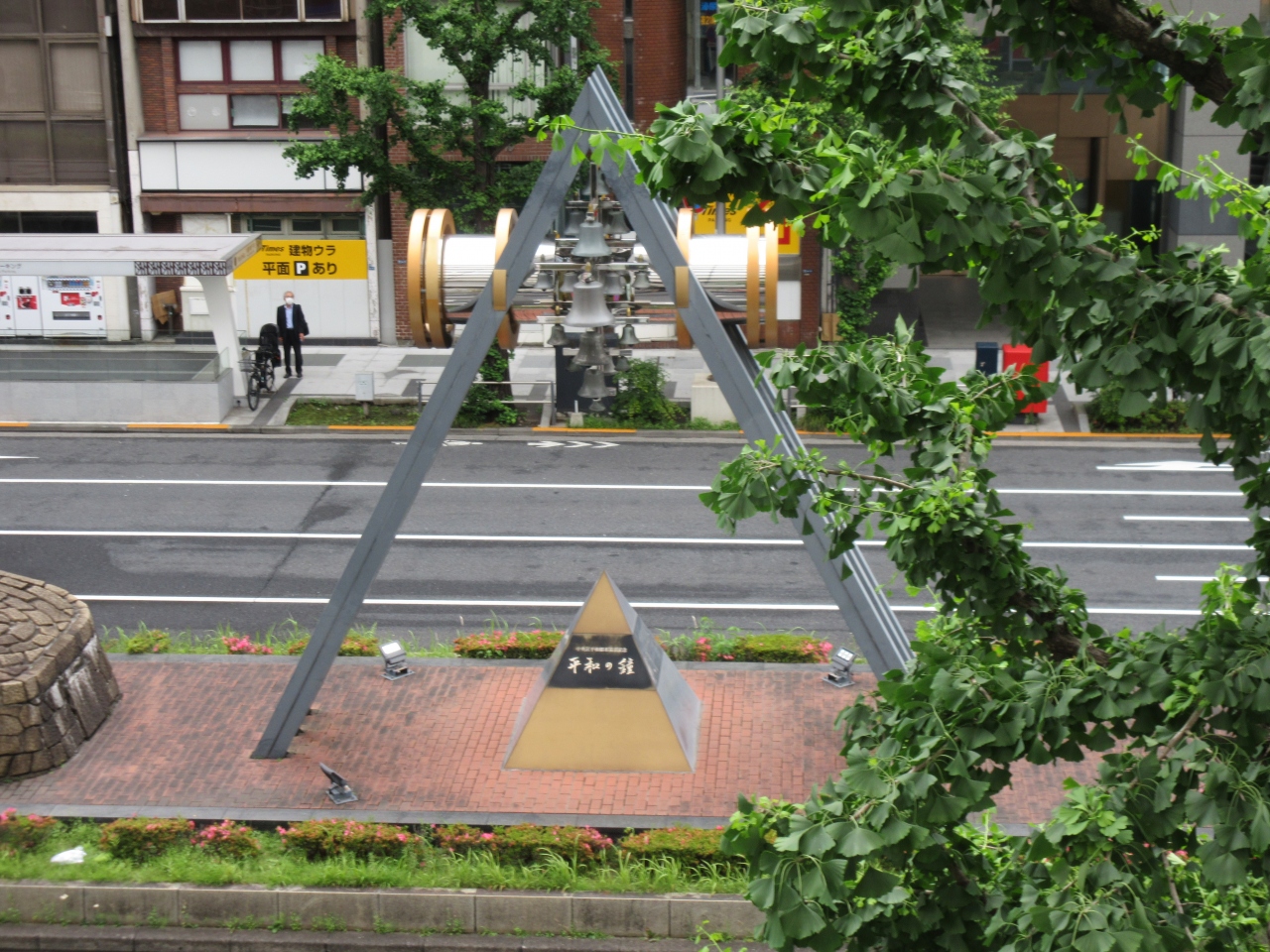 八重洲通りの中央分離帯に、中央区が1989年に設置したものです。三角の柱に26個のカリヨンがついていて、毎定時に音楽を奏でます。