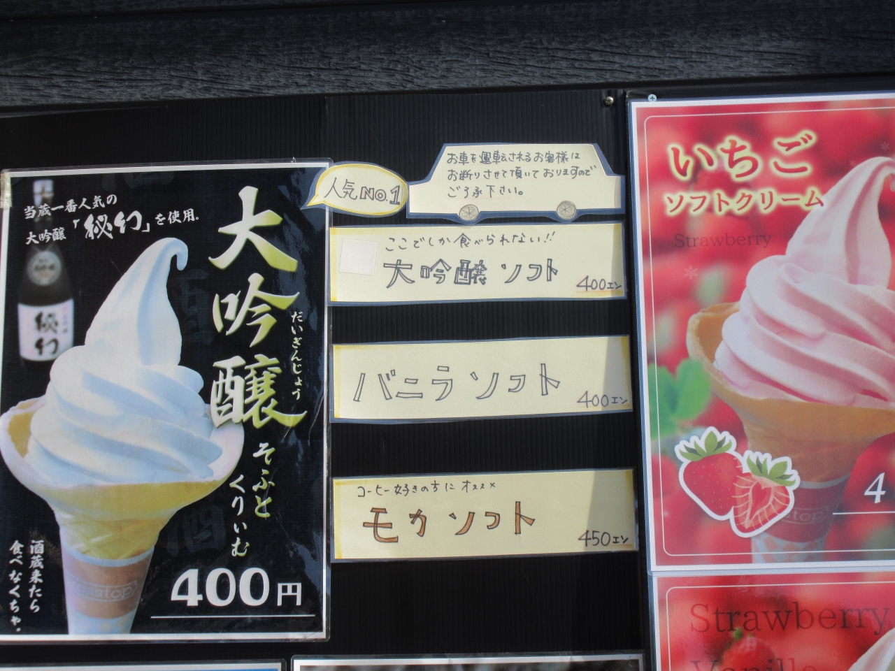 酒造店が経営するドライブインの駐車場にある仮設店舗で、いろいろなソフトクリームを販売しています。バニラ、イチゴ、モカなどの他に、酒造所ならではの『大吟醸ソフト』がこの店ならではのソフトクリームです。