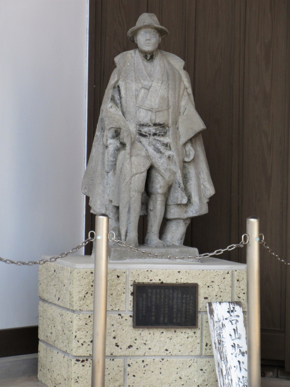 1957年に暮坂峠に詩碑と共に設置された牧水像がこれで、コンクリート製です。マントを羽織って峠を行く旅姿のようです。その後ブロンズ像に変わっことから、初代のこの像がここに移転されたそうです。- 旅行時期