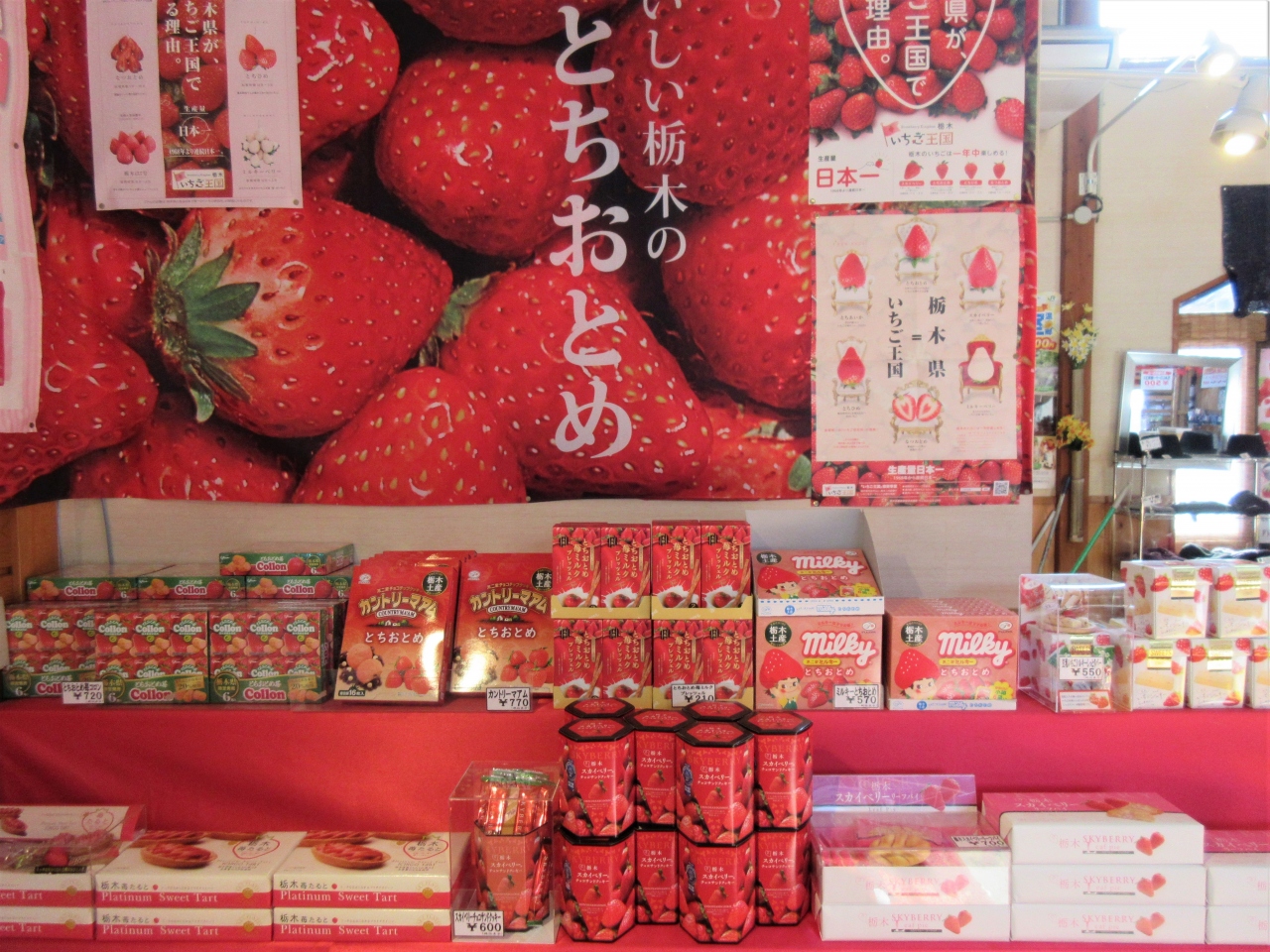 「森林の駅」という名のお土産店は、農産物直売所でもあるし、空いていました。ゆっくり眺めていたら、ポスターに「栃木県いちごの生産日本一」と書いてありました。確かに、いちごをあしらったお菓子などがたくさん揃っていました。