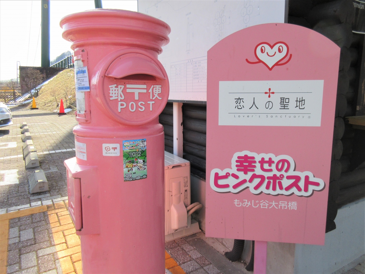チケット売り場の裏に「幸せのピンクポスト」が立っているのを初めて見ました。昔の赤い円柱型ポストが綺麗なピンク色に塗られていました。本物の郵便局員さんがバイクで集配に来たので本物です!