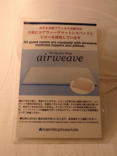 最近は枕に特徴を出しているホテルが増えてきましたが、エアウィーブのマットレスは初めてでした。柔らかすぎるベッドが苦手な私にとってちょうどいい感じ。枕もエアウィーブでとても快適。