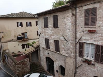 アッシジ街外れの駐車場からもすぐのホテル・ジオット。ホテルの前の道をまっすぐ行くだけで、サン・フランチェスコ聖堂に行くことができます。ぶらぶら歩いても5分くらい。朝でも夜でも、いつでも行けるのがいいですね。
