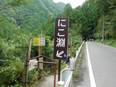 にこ淵へは、一段の高さがかなりある階段をずっと降りていきます。淵のそばは岩の上を移動することになるので、しっかりした靴と健脚の人以外は、かなり苦労することになります。