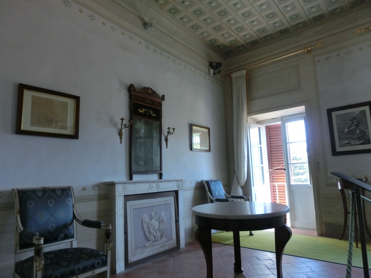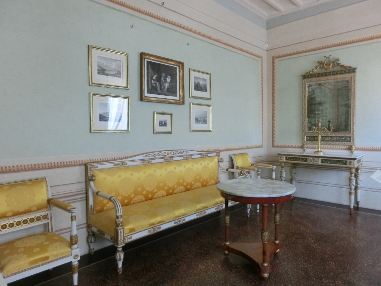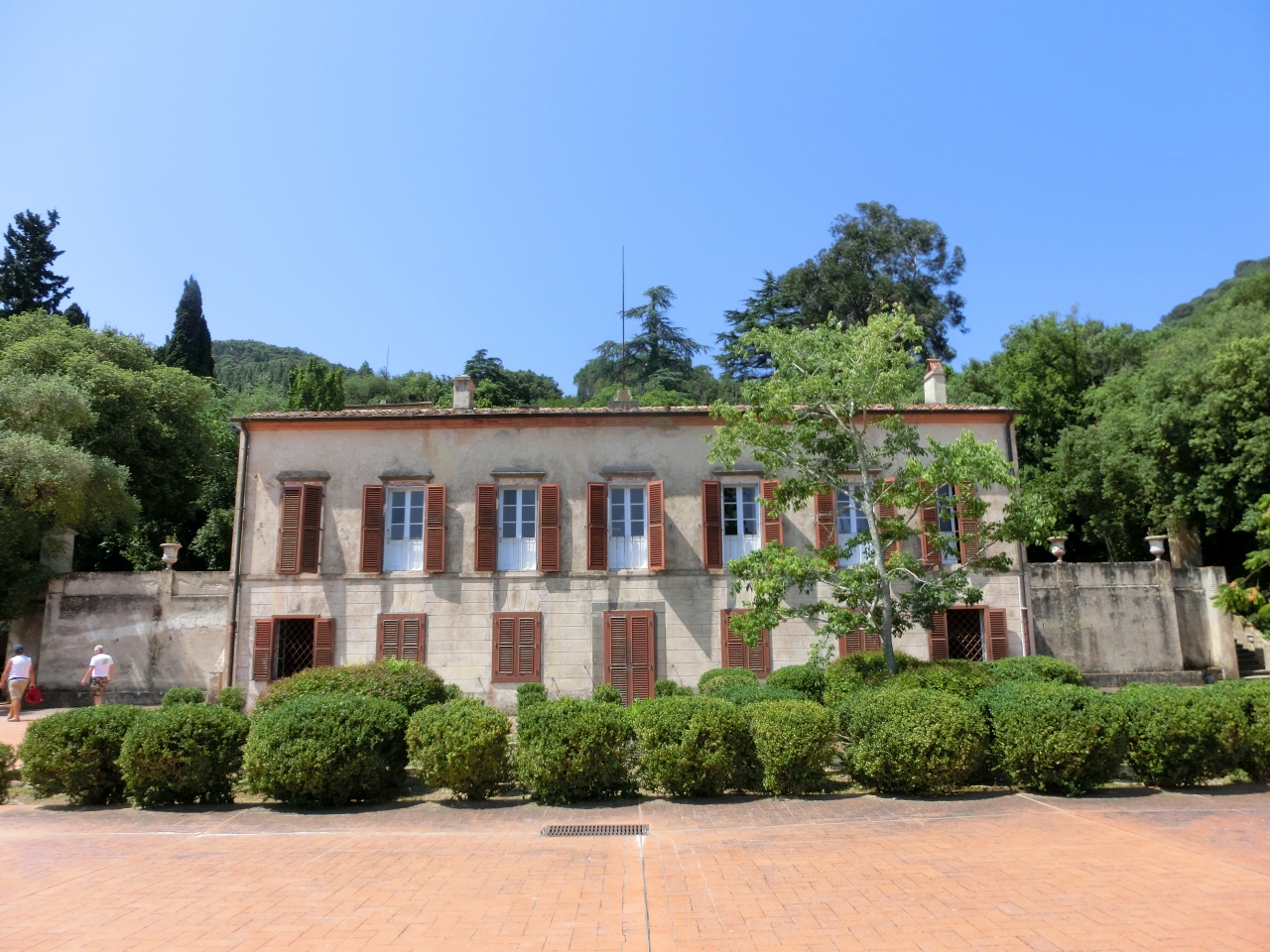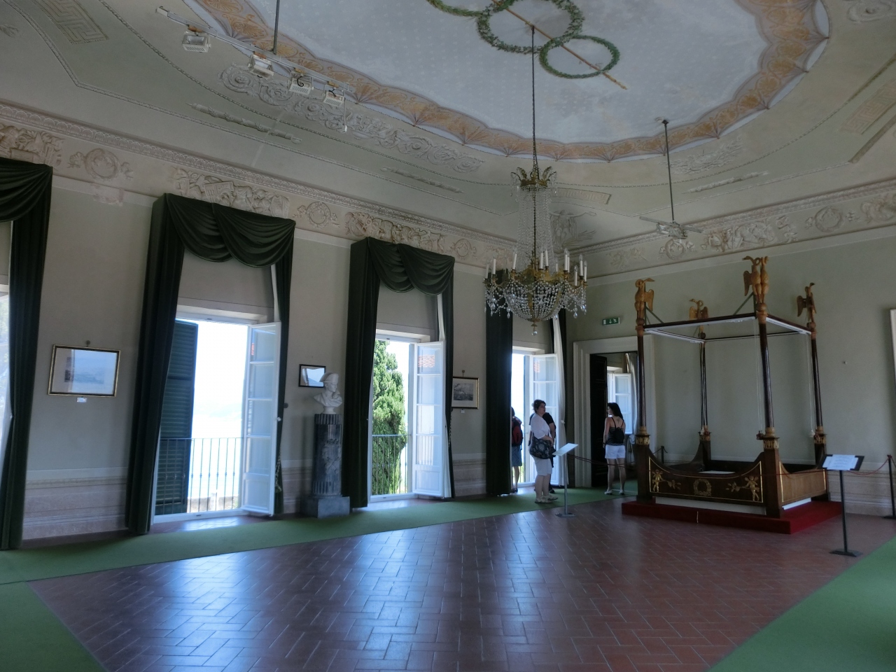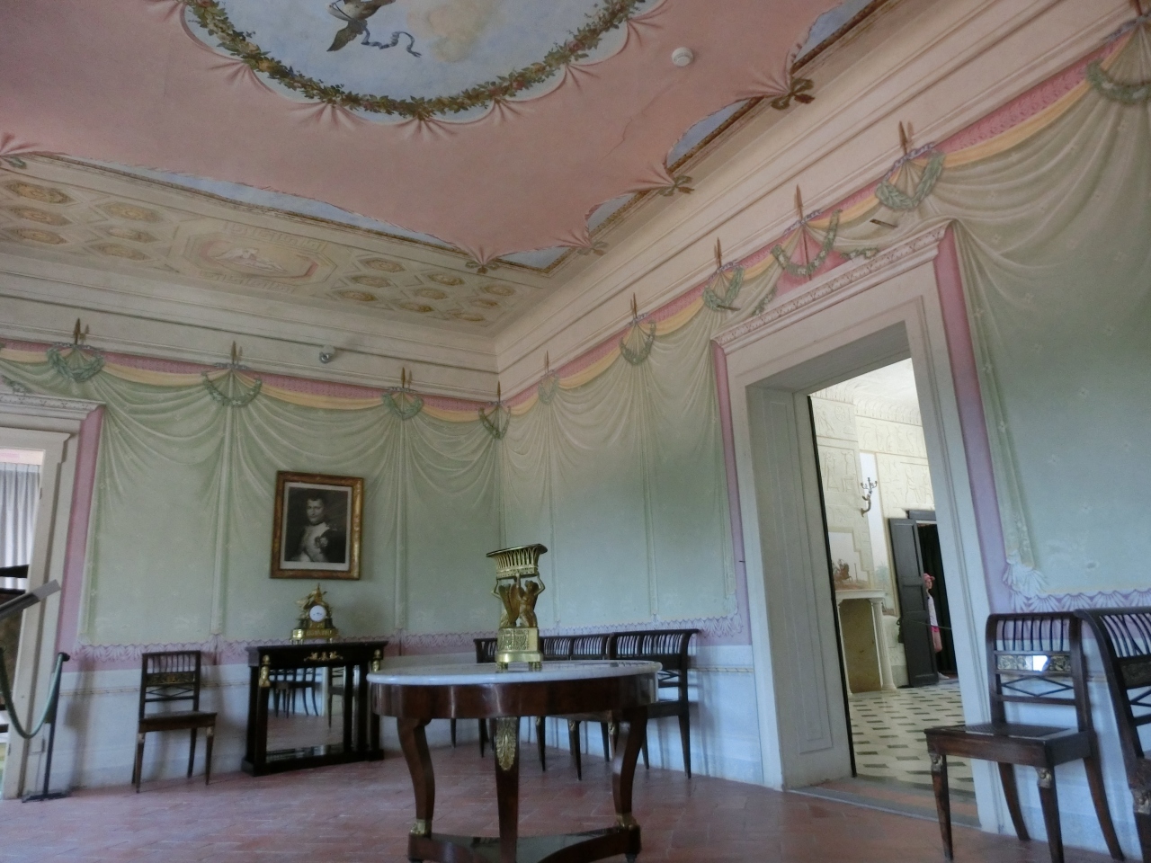 ポルトファライオのバスターミナルから15分(夏季1時間に1本)で着きます。参道のような道をすすむと博物館があり、左手に行くと切符売場があり、さらに登ると別荘があります。淡いピンク色の部屋など小ぶりながらも美しいしつらえです。