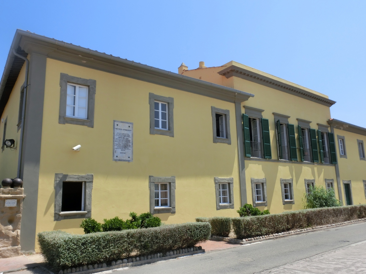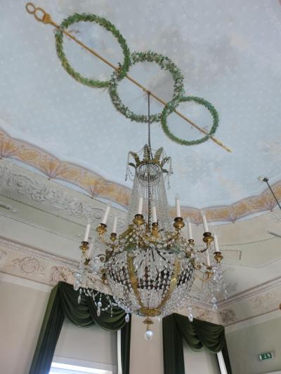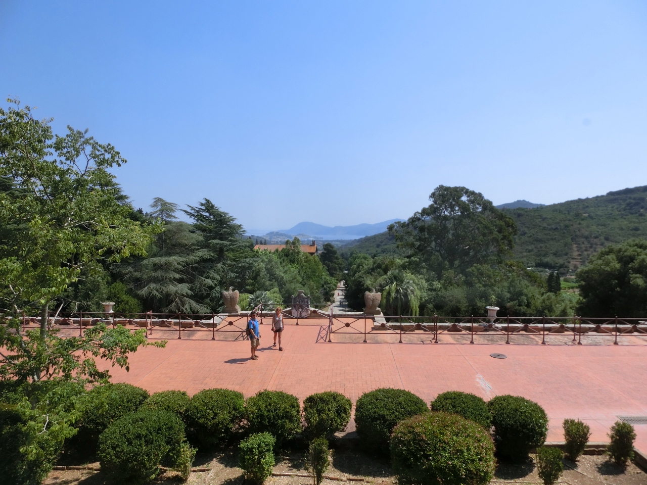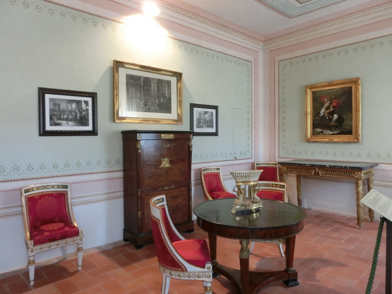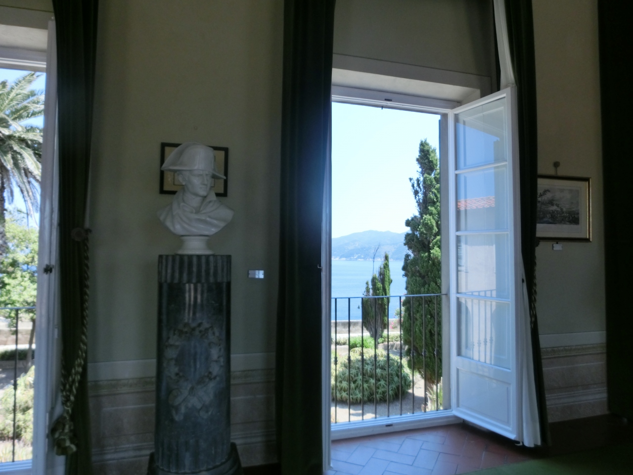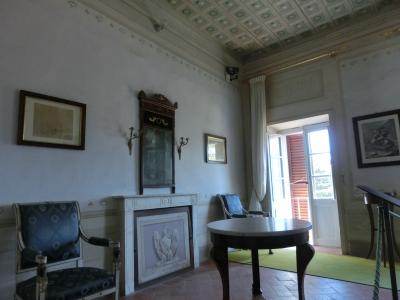 ポルトファライオのバスターミナルから15分(夏季1時間に1本)で着きます。参道のような道をすすむと博物館があり、左手に行くと切符売場があり、さらに登ると別荘があります。淡いピンク色の部屋など小ぶりながらも美しいしつらえです。