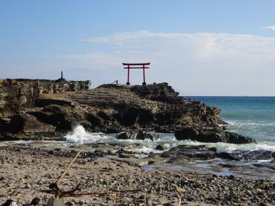 神社のすぐ裏側に位置する「白浜海岸」白波が打ち寄せるところにも朱い鳥居...