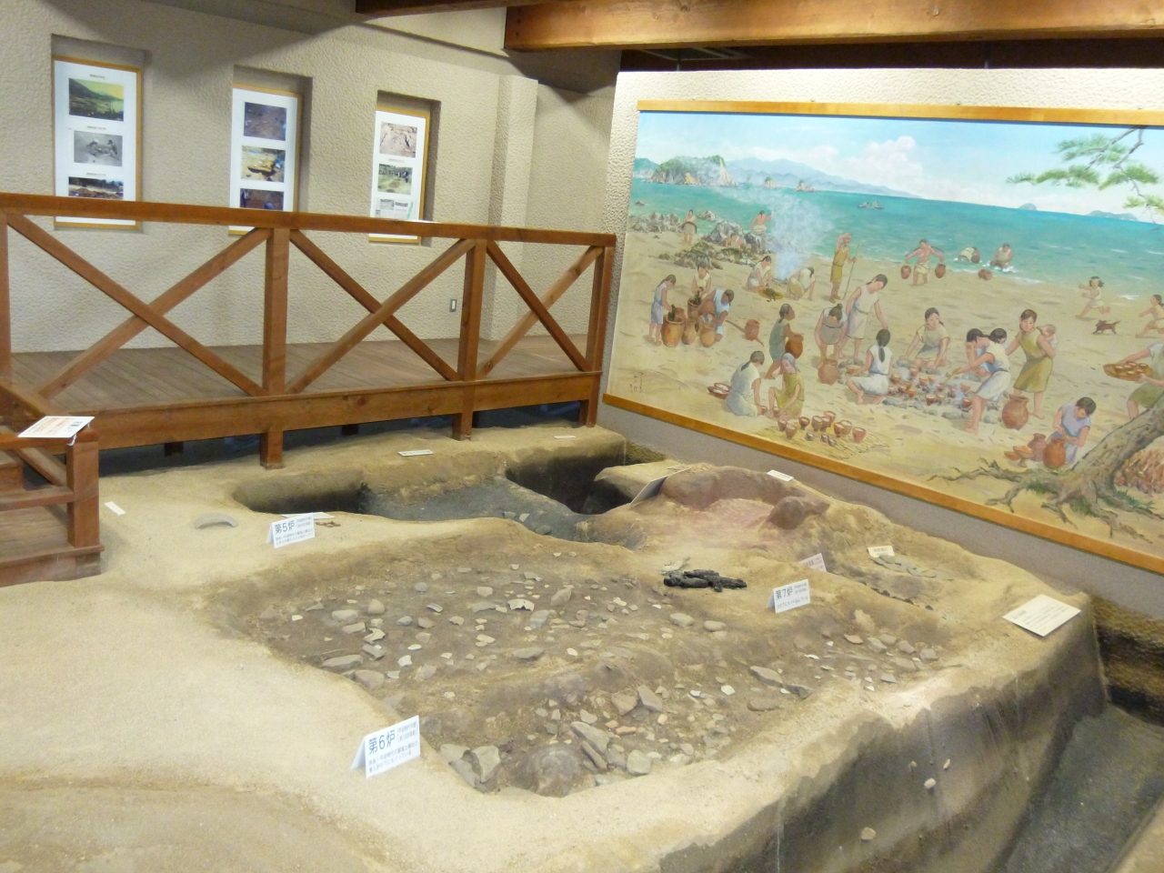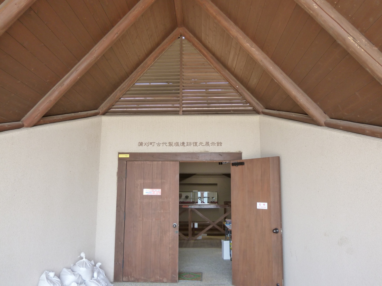 古代の製塩土器の底の部分が出土した後、製塩遺構が出土したことから解明が進み、古代の製塩遺跡を再現した展示館です。藻を使って手間隙をかけて作った塩はおいしそうです。昔の人はよく考えていましたね。前に広がる海と砂浜の美しさと相まって、古代ロマンへ思いが行きました。