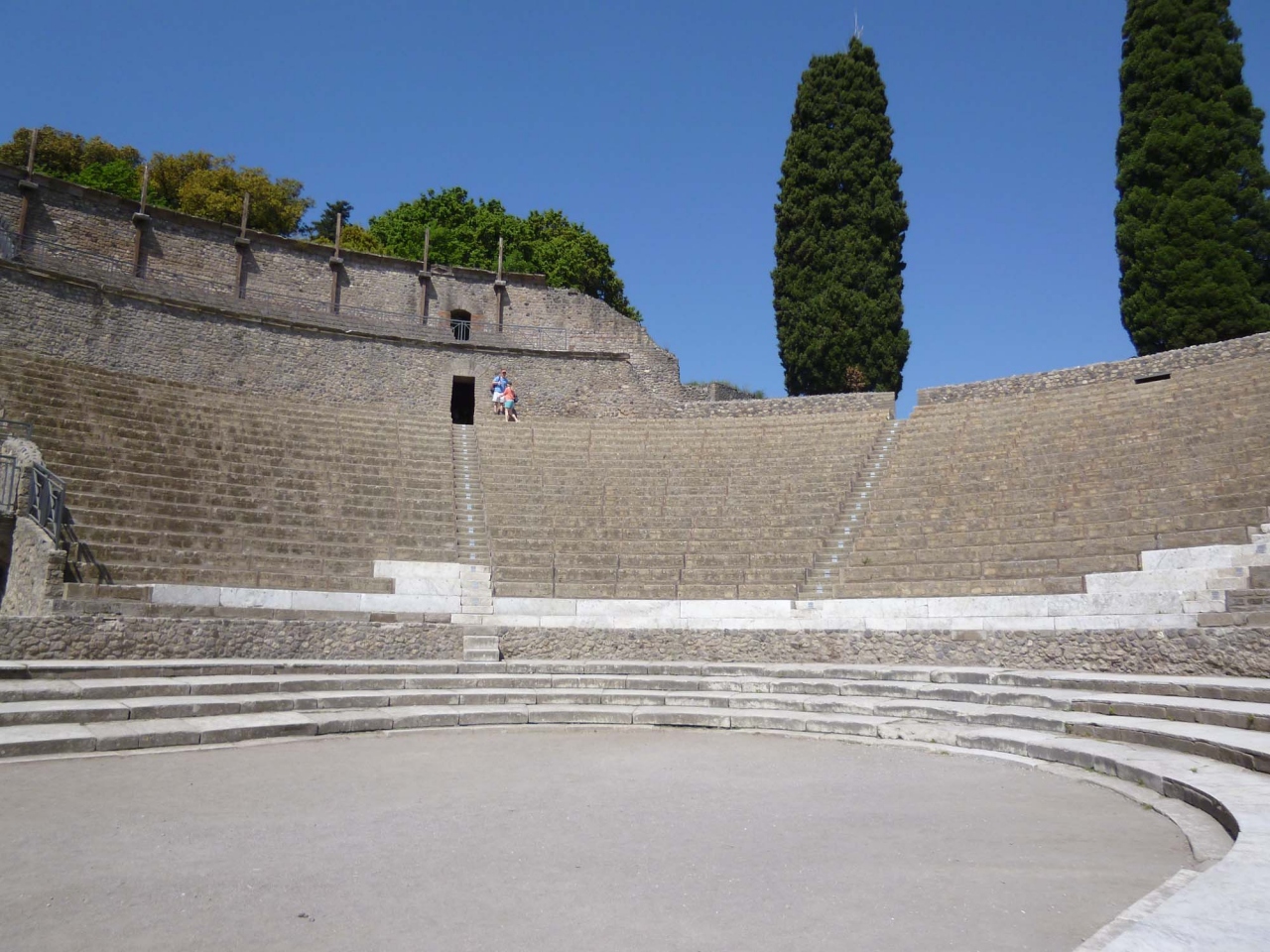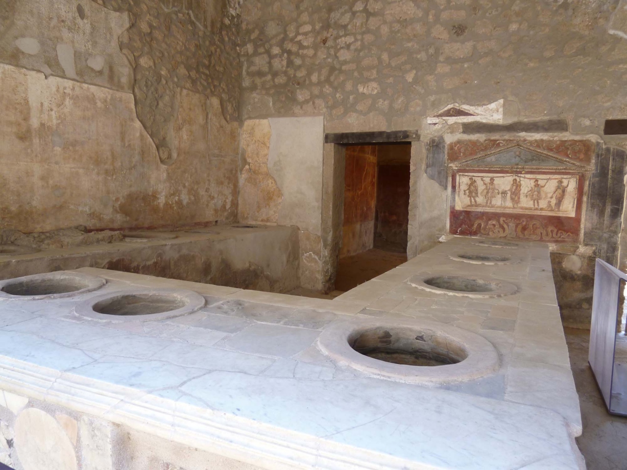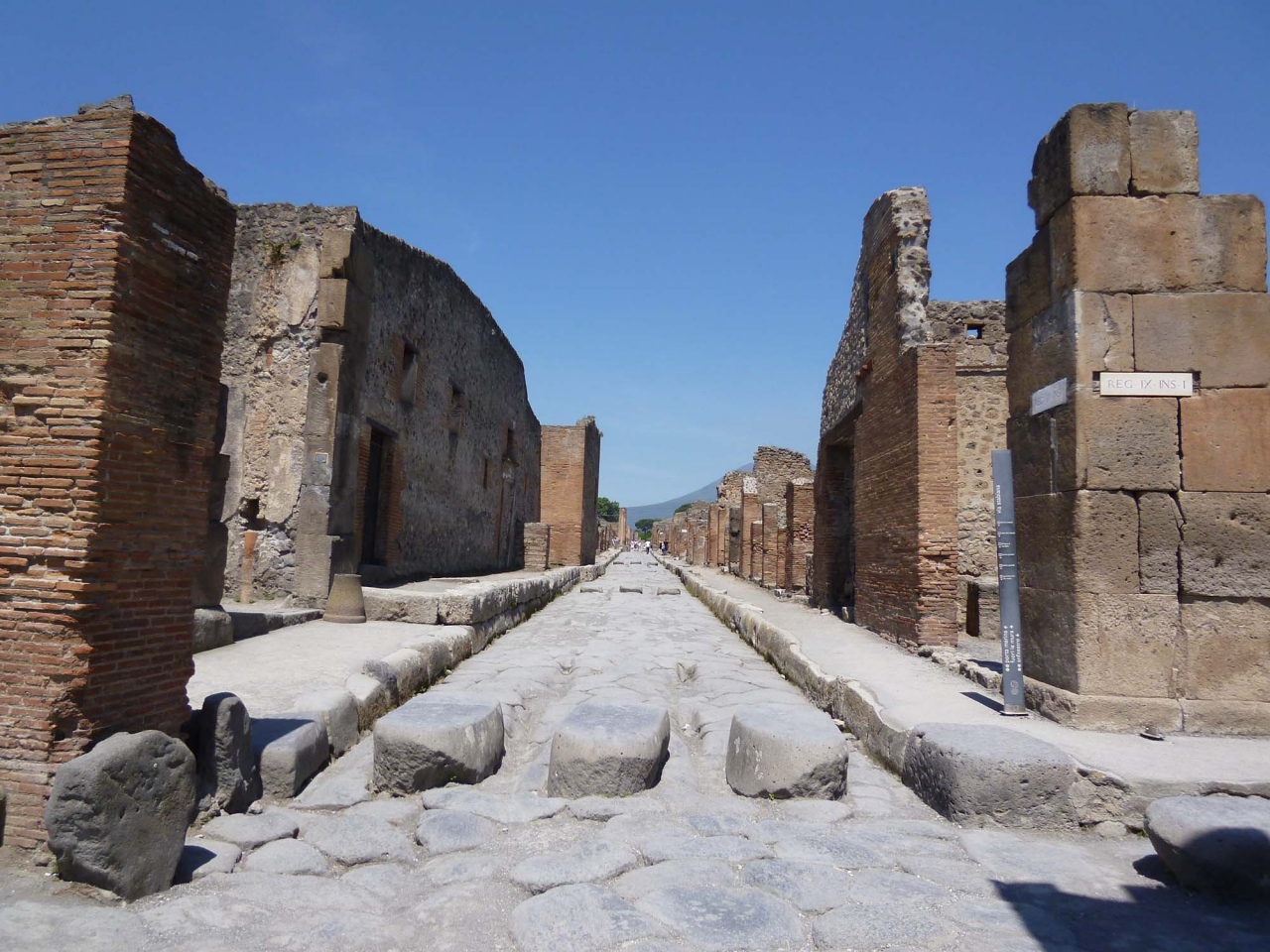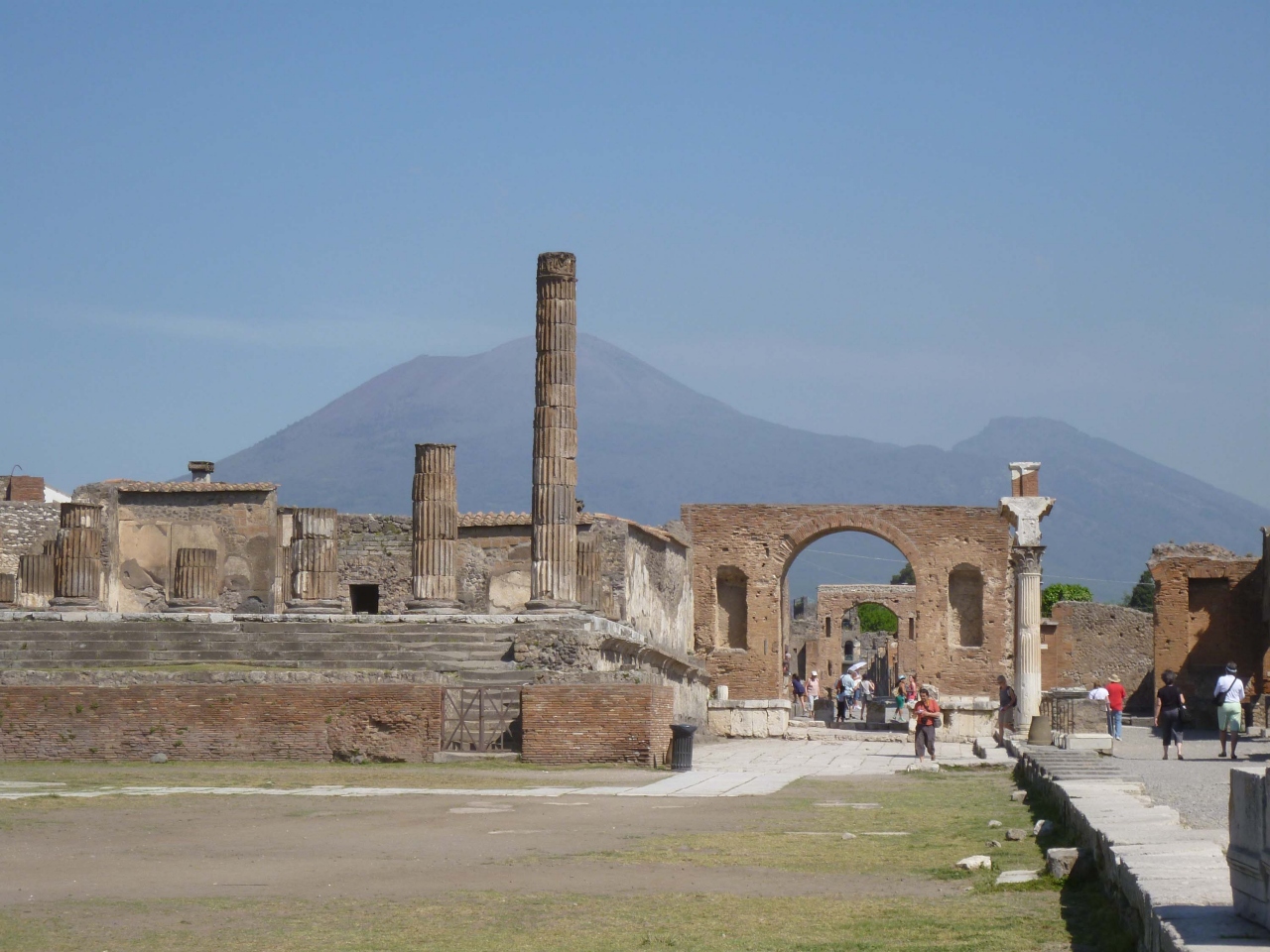 マリーナ門の入り口でもらった地図と説明書を見ながら歩き出しました。まずはフォロ広場へ。ベスビオ山が背景となりなかなかきれいです。崩れかけたバジリカやアポロ神殿がいにしえの栄華を感じさせます。又浴場、円形闘技場、ステファノの洗濯屋やアッポンダンツア通りにあるトラットリアのような家、壁の絵など見所がたくさんありました。大通りには水のみ場があったり、きわめて文化的な生活をしていたのが良く分かります。